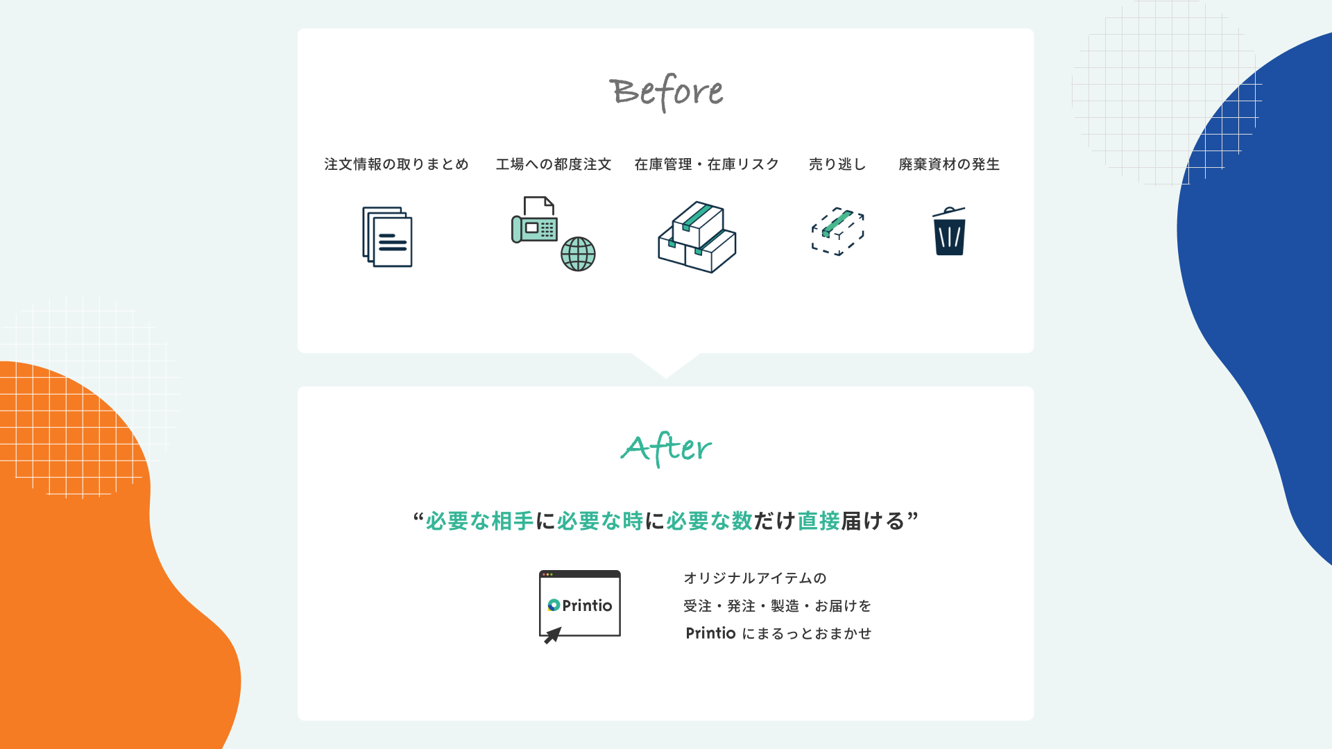 〈Printio〉は、事業者のビジネスに「組み込める」ものづくりサービスを提供し、ものづくりの新たなインフラを目指す「Factory as a Service」です。