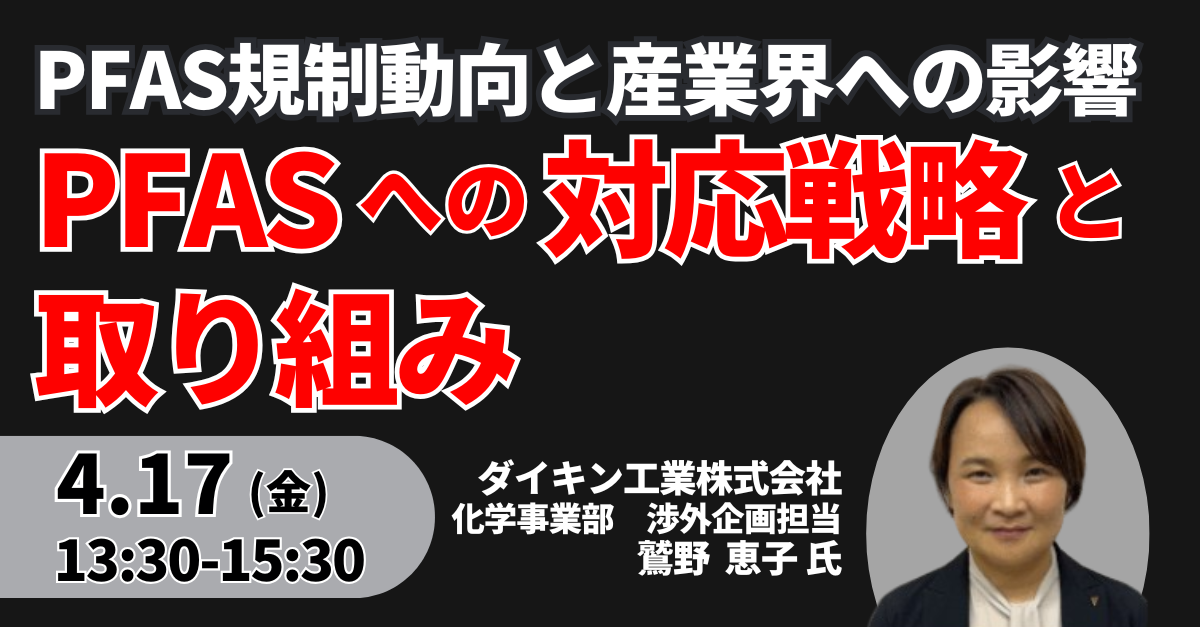 JPI(日本計画研究所)は、ダイキン工業株式会社 化学事業部 渉外企画担当 鷲野 恵子 氏を招聘し、ダイキン工業(株)におけるPFASへの対応戦略と取り組みについて詳説いただくセミナーを開催します。