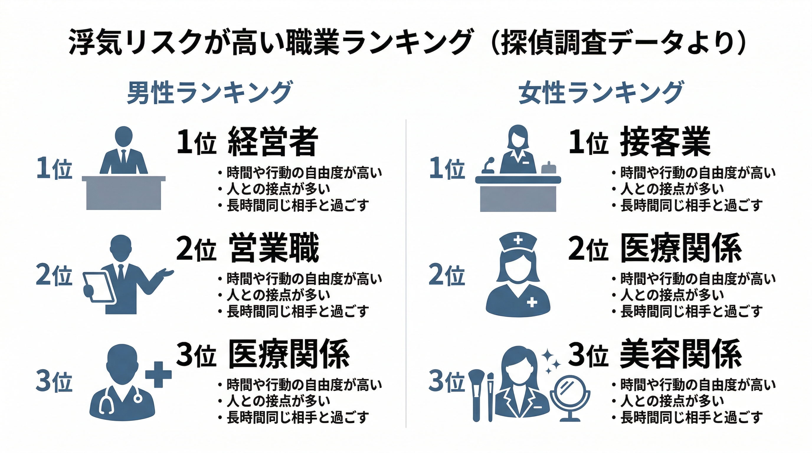 RESTART探偵事務所の調査・相談データからは、「時間の自由度が高い」「異性との接点が多い」などの条件を持つ職業において、浮気のリスクが高まる傾向が見られました。