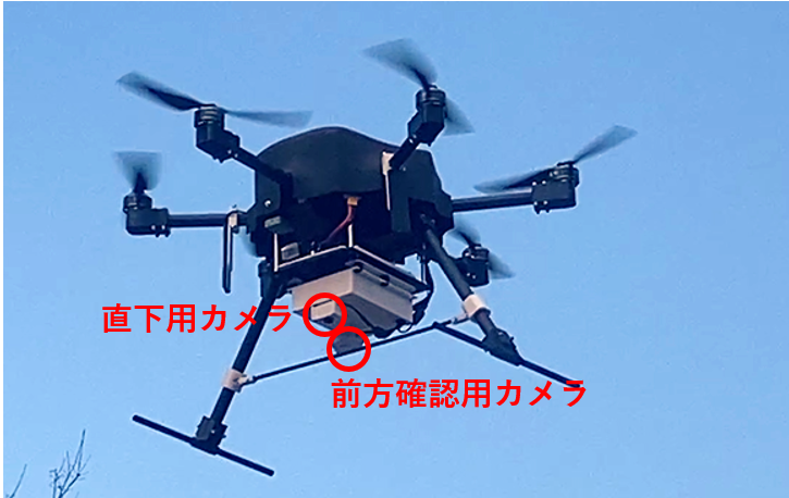 本ドローンは機上カメラを2基搭載しておりドローン直下及び前方を常時確認しながら飛行し、人や車、動物などを映像上で認識すると一時停止し、エリア外になるまで待機します。
