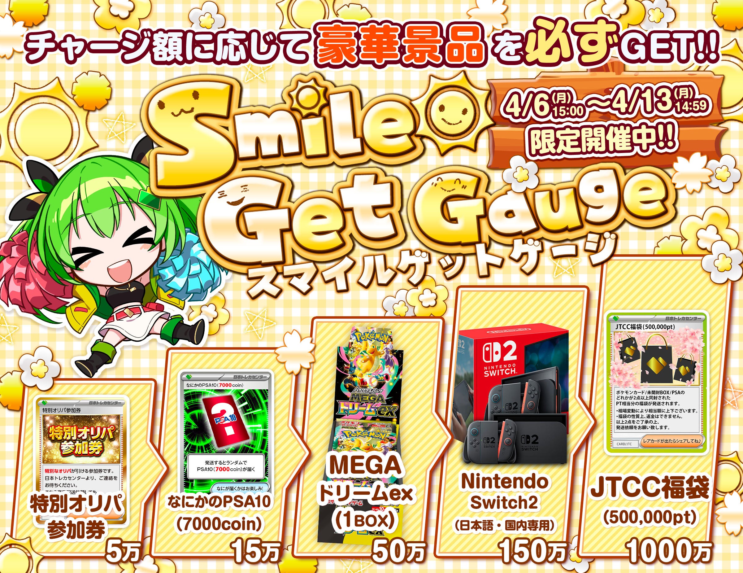 株式会社日本トレカセンターは、オンラインオリパサービス「日本トレカセンター」において、2026年4月6日(月)15:00より、期間限定イベント「Smile Get Gauge(スマイルゲットゲージ)」を開催いたします 。