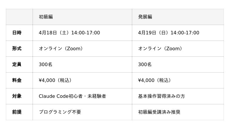 Claude Code 実践講座(初級編 4/18・発展編 4/19)