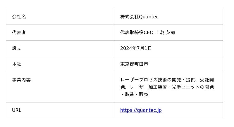 レーザープロセスを物理現象レベルから解析し、材料や用途に応じて最適な加工条件を設計する株式会社Quantec(本社:東京都町田市、代表取締役CEO:上瀧英郎、以下「当社」)は、このたび、株式会社ベンチャーラボインベストメントが運営するファンドを引受先とする第三者割当増資を実施いたしました。