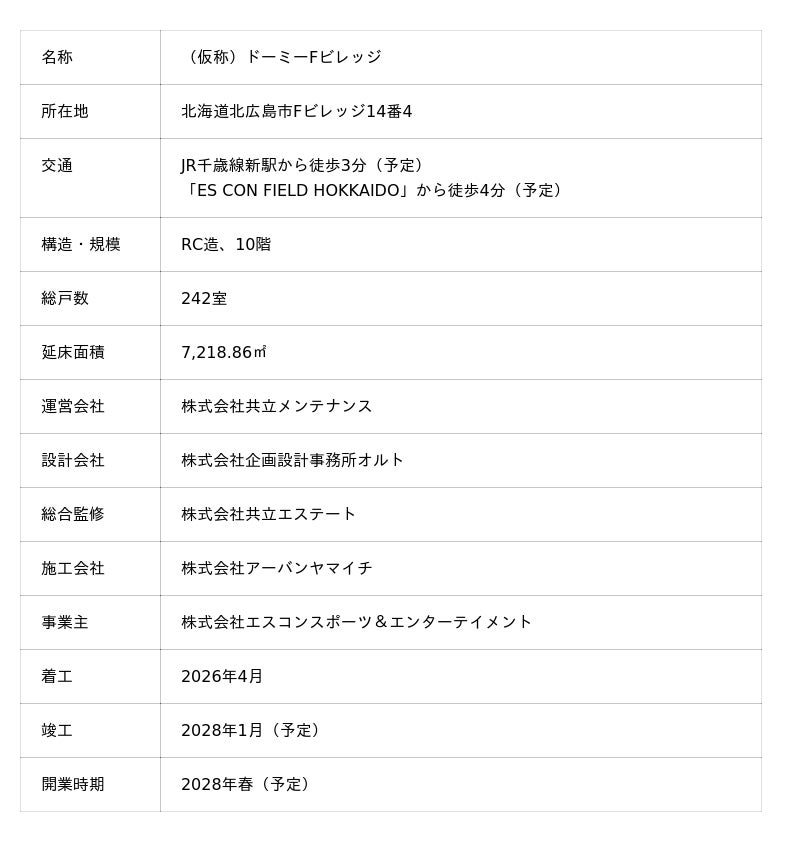 株式会社エスコン(本社:東京都港区、代表取締役社長:伊藤貴俊)の連結子会社である株式会社エスコンスポーツ&エンターテイメント(以下「ESE」)は、北海道北広島市の「北海道ボールパークFビレッジ(以下「Fビレッジ」)」内において、賃貸レジデンス『(仮称) ドーミーFビレッジ(以下、本物件)』の工事に着手いたしましたのでお知らせいたします。本物件は、2028年春の入居開始を予定しており、株式会社共立メンテナンス(本社:東京都千代田区、代表取締役社長:中村幸治)が運営・管理をおこないます。