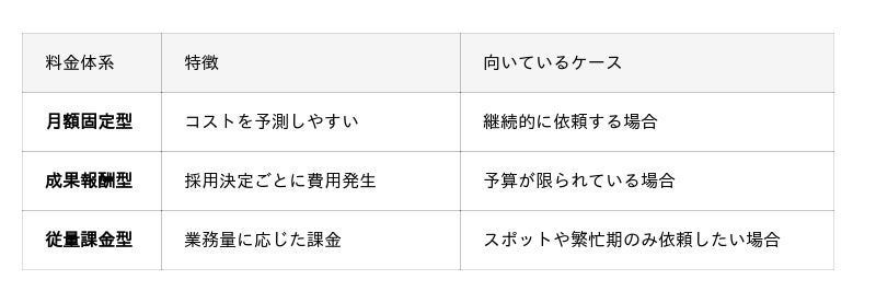 RPOの料金体系は主に3種類あります。自社の採用量や予算に応じて最適な形式を選びましょう。