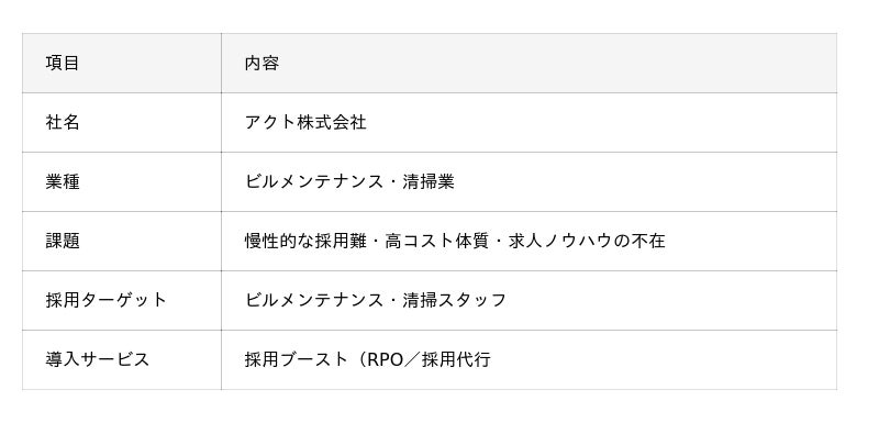 これは、ビルメン業界の採用ターゲット(安定志向・地域密着・未経験歓迎)と採用ブーストのRPO運用ノウハウが噛み合った結果です。