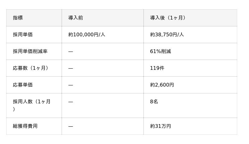 - 採用単価61%削減(約10万円 → 約3.9万円)- 1ヶ月で8名採用という即効性- 週次PDCAによるスピード改善で、効果の出ない施策を放置しない運用体制の構築- 勝ちパターンのナレッジ化により、担当者が変わっても再現可能な採用の仕組みを確立