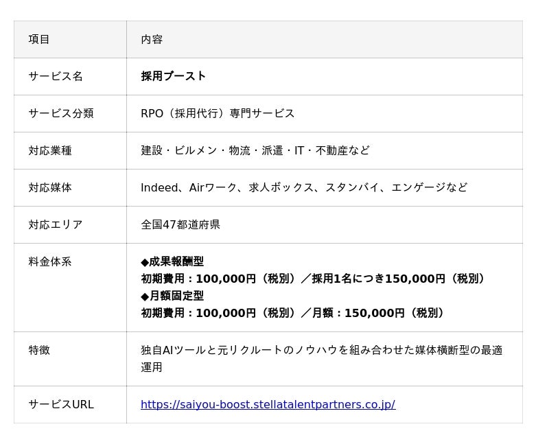 採用ブースト」は、RPO専門サービスとして成果報酬型・月額固定型の2つの料金体系を用意しており、元リクルートのノウハウと独自のAIツールを組み合わせた運用を特徴としています。