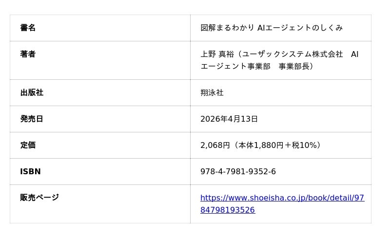 ユーザックシステム株式会社(本社:大阪市中央区、代表取締役:小ノ島尚博、以下 当社)は、このたび当社社員である上野 真裕(AIエージェント事業部 事業部長)が、AIエージェントに関する書籍『図解まるわかり AIエージェントのしくみ』(出版社:翔泳社)を執筆し、2026年4月13日に出版されることをお知らせいたします。