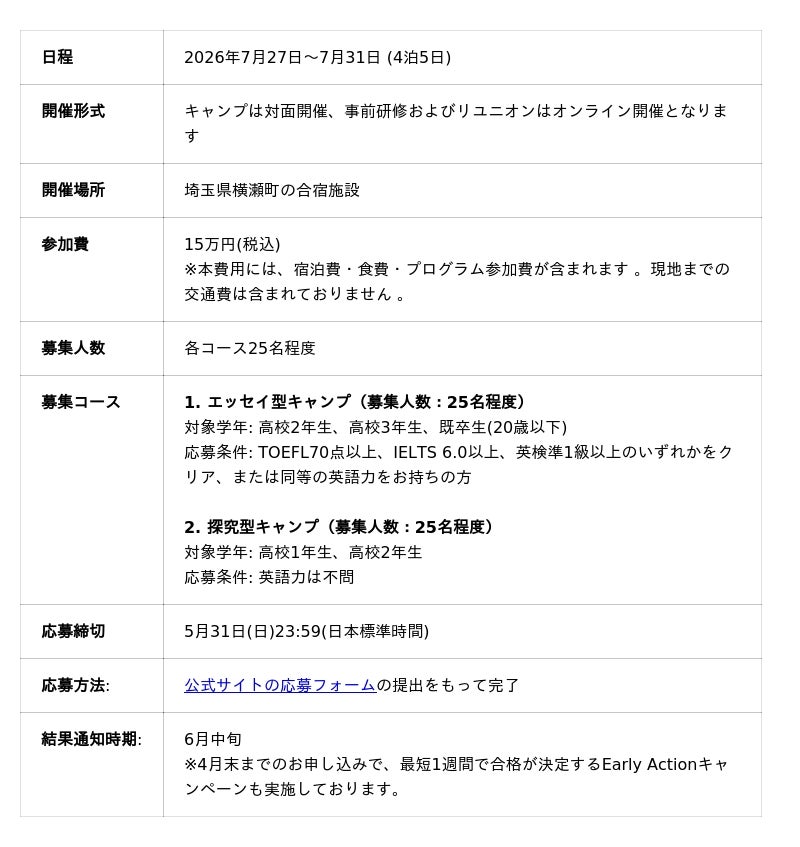 本キャンプ開催に際し、海外進学に意欲がありながらも、地域要因や経済的困難等から海外大学進学を視野に入れることが難しい高校生に向け、15万円の参加費が無料になる「全額免除枠」を最大20名分用意いたしました 。
