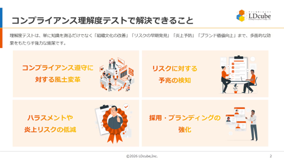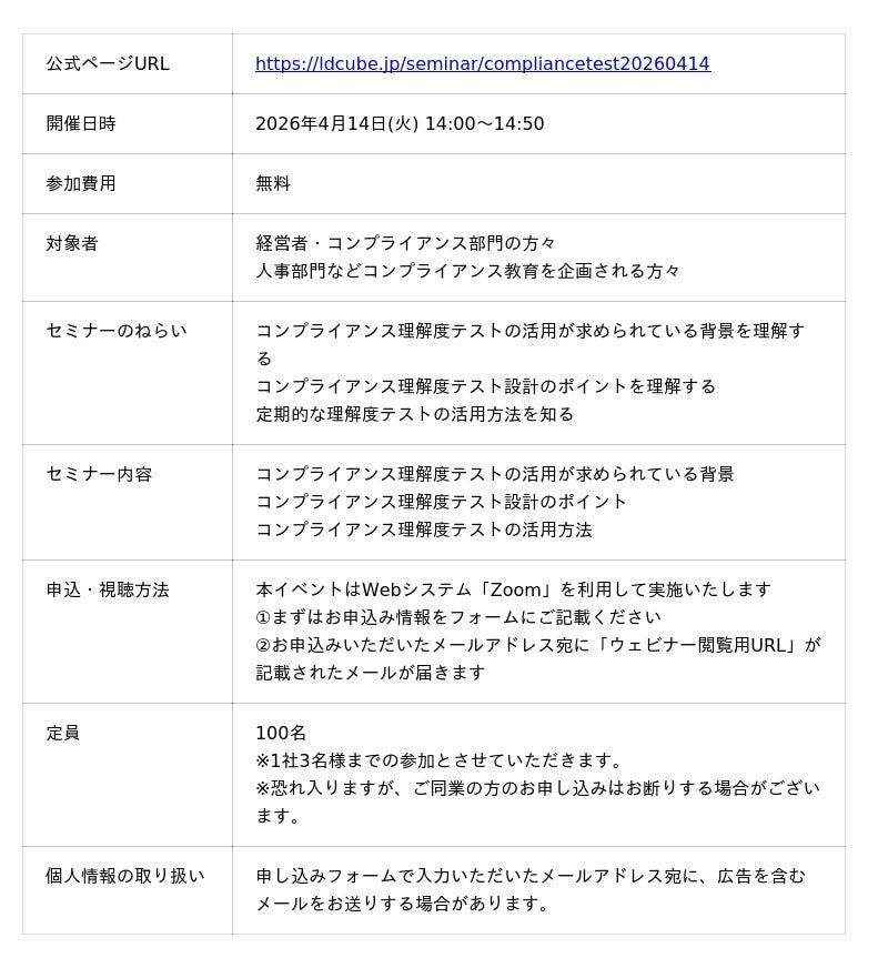 「コンプライアンスの『意識と知識』を定着させるには?~効果的な理解度テスト実施のポイントを解説!」ウェビナーを開催(4月14日14:00~14:50)株式会社LDcube