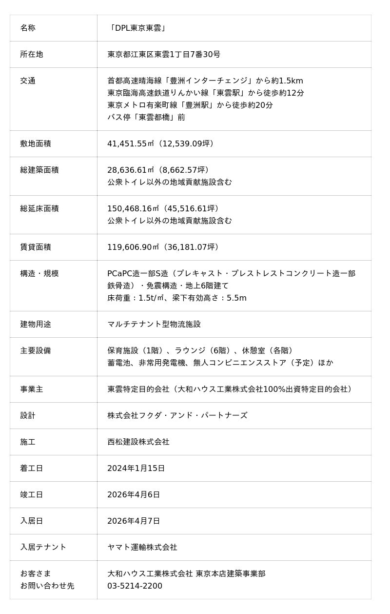 大和ハウス工業株式会社(本社:大阪市、代表取締役社長:大友浩嗣)は、2024年1月より、東京都江東区において、大型マルチテナント型物流施設(※1)「DPL東京東雲(しののめ)」(地上6階建て、敷地面積:41,451.55平方メートル 、総延床面積:150,468.16平方メートル (※2))の開発を進めてまいりましたが、2026年4月6日に竣工しました。