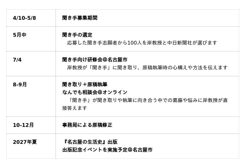 中日新聞社(名古屋市中区、大島宇一郎社長)は、創業140年記念事業として、名古屋にゆかりある100人の人生を、公募した参加者とともに記録する書籍 『名古屋の生活史』(2027年夏刊行予定)を制作するプロジェクトを4月10日に始動し、それにともない100人の「聞き手」の公募を開始いたします。