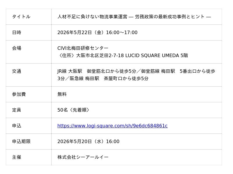 株式会社シーアールイー(代表取締役社長COO/亀山忠秀 本社/東京都港区)は、2026年5月22日(金)16:00~17:00、無料来場型セミナー「人材不足に負けない物流事業運営 ― 労務政策の最新成功事例とヒント ―」を開催いたします。