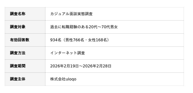 戦略型RPOサービスを提供する株式会社uloqo(本社:東京都港区/代表取締役:関川懸介、以下「uloqo」)は、カジュアル面談を受けた経験のある転職者934名を対象に、カジュアル面談に関する実態調査を行いました。
