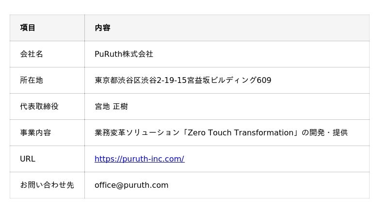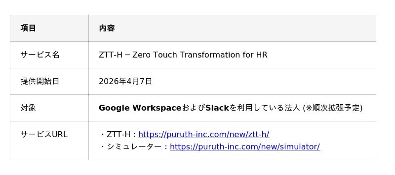 2026年4月7日、PuRuth株式会社(本社:東京都渋谷区、代表取締役:宮地 正樹)は、AI駆動型の勤怠・労務・稼働管理業務変革ソリューション 「Zero Touch Transformation for HR:ZTT-H」 の提供を開始いたします。ZTT-H(ゼット・エイチ)は、3月に提供を開始した経費精算ソリューション「ZTT-E」に続く、ZTTシリーズ製品の第2弾。従業員がカレンダーに記録した日々の活動情報から、出退勤・労働時間・残業・有給休暇等の取得情報を自動で収集・判定・集計し、勤怠管理/稼働管理/労務管理をZero Touchで完結させます。出退勤の打刻も、勤怠表の入力も、面倒な修正作業も不要 ── ルール通りにカレンダーを使い、普段通り仕事をするだけで、勤怠管理業務が完了します。