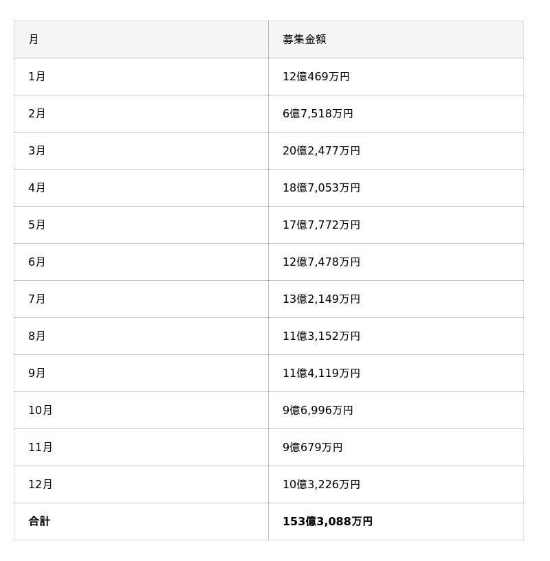 2025年は年間を通じて高水準の募集が続き、なかでも3月・4月・5月の3ヶ月は前年(2024年)の月間最高額13億3,802万円(8月)を上回る実績となりました。
