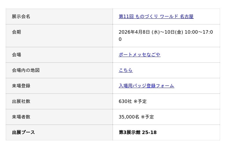 最先端のテクノロジーを活用し、製造業の業務改善を支援する営業製作所株式会社(本社:大阪府大阪市、代表取締役社長:西島本 周)は、2026年4月8日(水)から10日(金)までポートメッセなごやで開催される「第11回 ものづくりワールド名古屋」に出展いたします。(第3展示館 25-18)