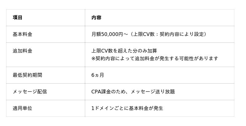 基本料金50,000円(上限25件)+ 追加CV数10件 × CPA 2,000円 = 合計70,000円