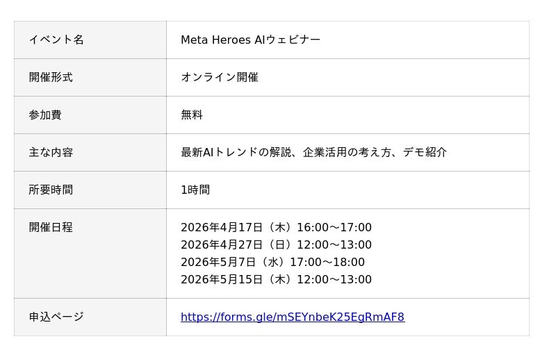 今回のウェビナーは、AI活用の初動を加速させたい企業に向けた無料の実践型セミナーです。Meta Heroesでは、ウェビナー参加をきっかけに、企業ごとの課題に応じたAI活用やDX推進の相談も受け付けています。申込は以下のフォームより可能です。