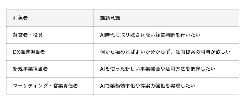 本ウェビナーは、AI活用に対して強い危機感を持ちながらも、何から着手すべきか整理できていない企業にとって、第一歩を具体化する場として設計されています 。とりわけ、業務改善、生産性向上、新規事業開発、営業・マーケティングの高度化を検討している企業にとっては、短時間で全体像を把握できる実践的な機会となります。