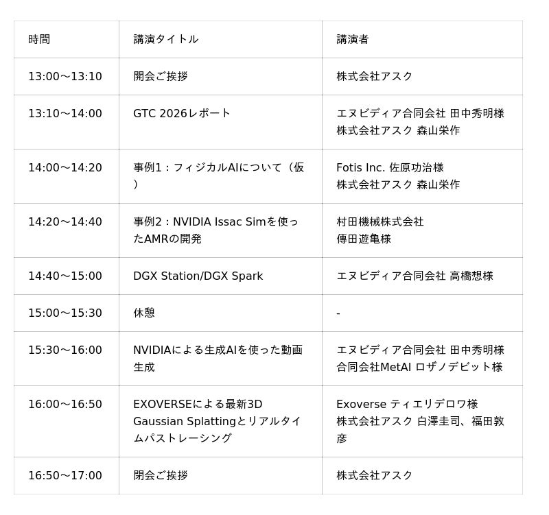 本カンファレンスは、「AIの力で日本を豊かに」をテーマに、3月に米国で開催されたGTC 2026の国内レポートを軸として、次の成長領域として注目されるフィジカルAIの最新ビジネス動向と、生成AI、ロボティクス、データセンター向けソリューションまで、AIインフラの全体像を一日で把握いただける内容となっています。当日は、NVIDIAをはじめとするパートナー各社によるセッションや展示を通じて、エンタープライズGPU、ローカル生成AI、ロボティクス、デジタルツイン、データセンター向けソリューションなど、アスクが提供する幅広いNVIDIA関連ソリューションをご紹介します。