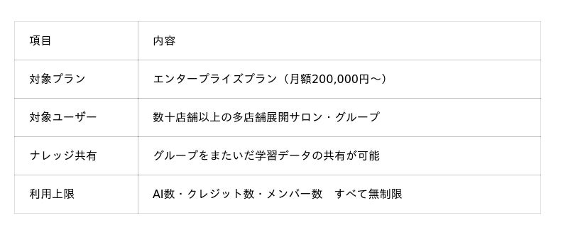 - 管理コストをゼロに全店舗・全AIを1つのダッシュボードで一覧確認。アカウントの切り替えが不要になる。- 学習リソースを削減「ナレッジ」機能で全店共通の接客マニュアルやキャンペーン情報を一度入力するだけで全AIに反映。繰り返し入力の手間がなくなる。- 店舗数が増えるほどお得AI数・クレジット・メンバー数がすべて無制限のため、多店舗・多スタッフ構成になるほどコストパフォーマンスが高まる。
