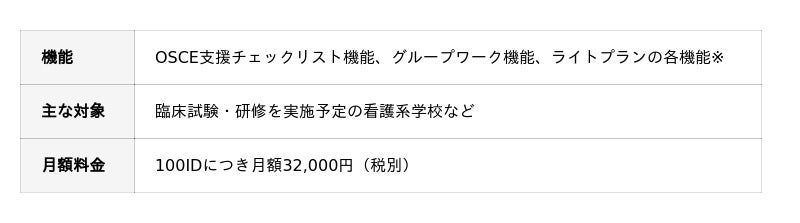 本プランは、従来のライトプランにOSCE支援「チェックリスト機能」と、実習指導に欠かせないグループワーク機能を追加したプランで、100IDにつき月額32,000円(税別)でご利用いただけます。