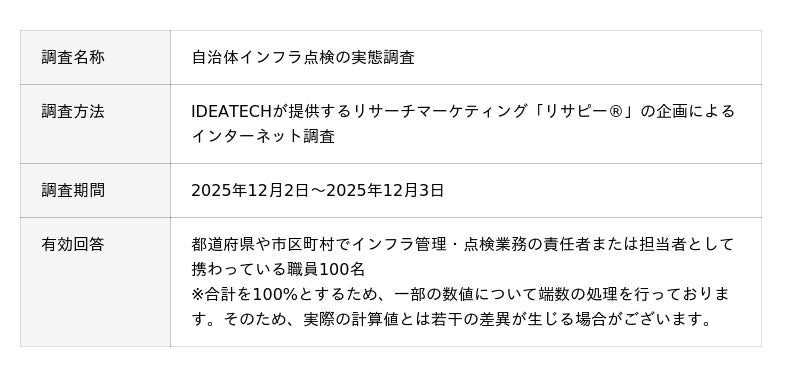 国土交通省が推進する「インフラ長寿命化計画」により、老朽化インフラの更新やデジタル技術を活用した点検の高度化が全国で急務となっています。こうした状況の中、本調査は人員不足やAI・ドローンなど新技術習得への不安、点検手法や製品選定の難しさなど、自治体の点検現場が抱える課題を明らかにし、インフラの維持管理水準の向上に貢献することを目的としています。