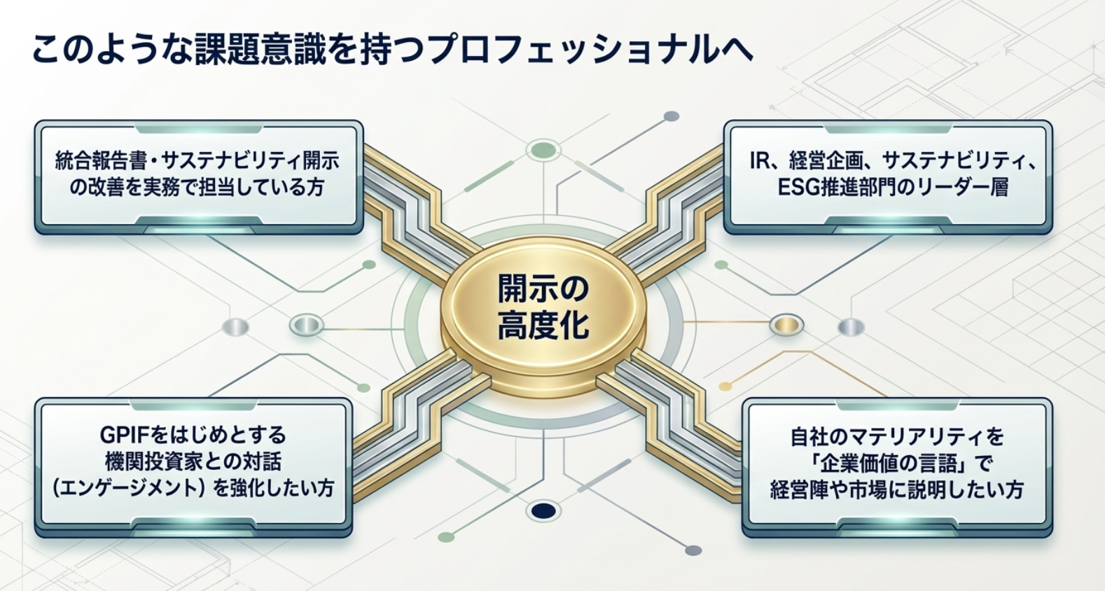 GPIFが重視する「優れたマテリアリティ開示」とは何か なぜマテリアリティの列挙だけでは評価されないのか 非財務情報を財務インパクトへ接続する視点 統合報告書で投資家に伝わる価値創造ストーリーの作り方 企業価値向上につながる開示改善の実務ポイント このような方におすすめ 統合報告書・サステナビリティ開示の改善を担当している方 IR、経営企画、サステナビリティ、ESG推進部門の方 GPIFや機関投資家との対話を意識した開示高度化を進めたい方 マテリアリティを企業価値の言語で説明したい方