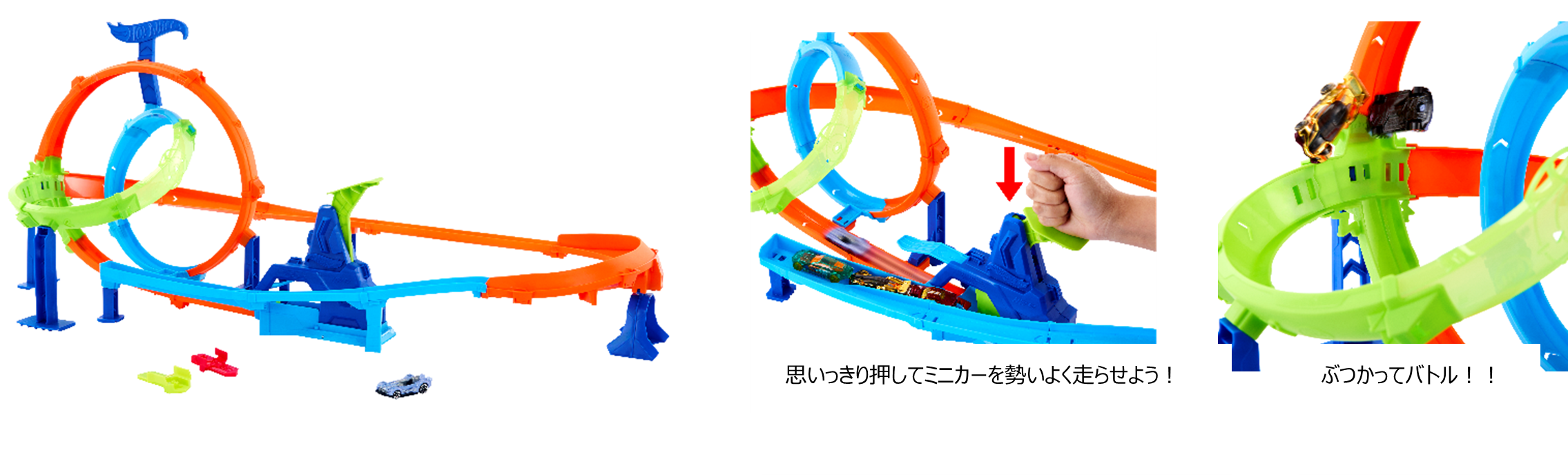 サイクロンクラッシュについている押し手を思いっきり押すことで、ダブルループの上に、ホットウィールのミニカーを勢いよく走らせて遊ぶことができます。2つの交差するダブルループを次々と走らせ、クラッシュゾーンを回避しましょう。最大4台のミニカーを同時に走らせることができ、自分で遊ぶのはもちろん友達とも一緒に競いあって遊ぶことができます。ホットウィール ミニカーが1台同梱されています。