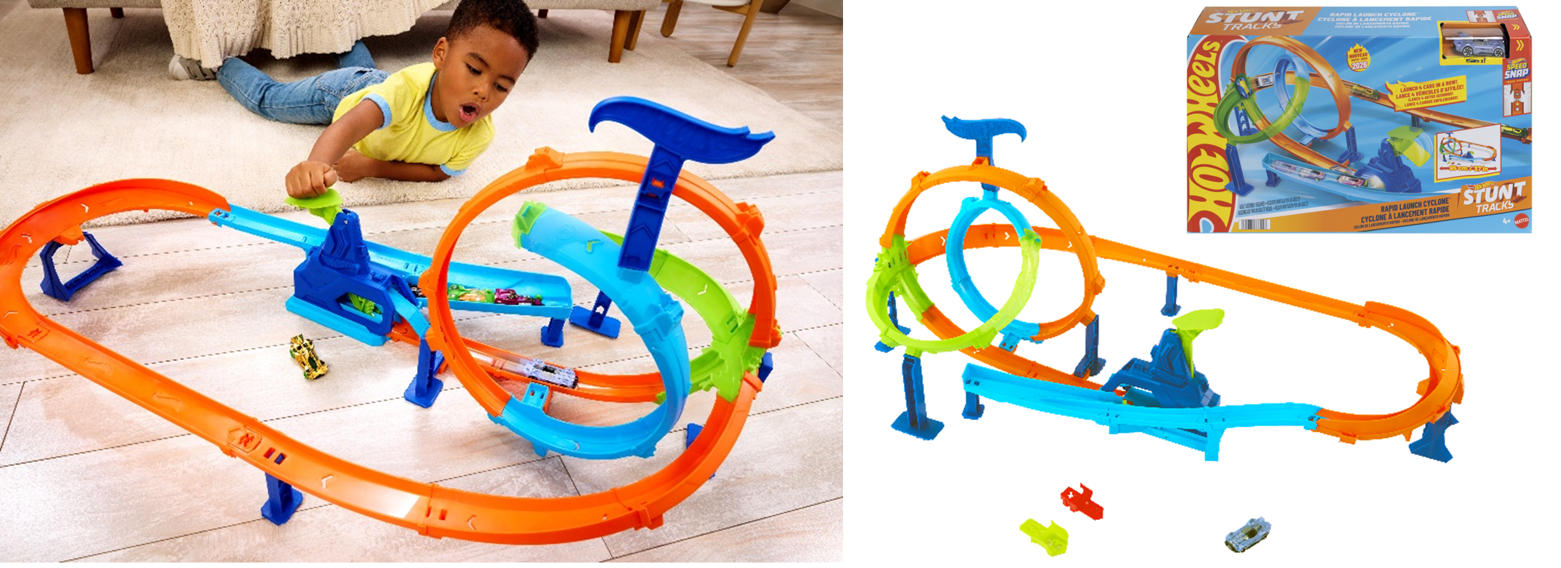 販売台数世界No.1*のミニカーブランド Hot Wheels(ホットウィール)より最大4台が同時走行可能で、友達とスピード感あるミニカー遊びが楽しめる!
