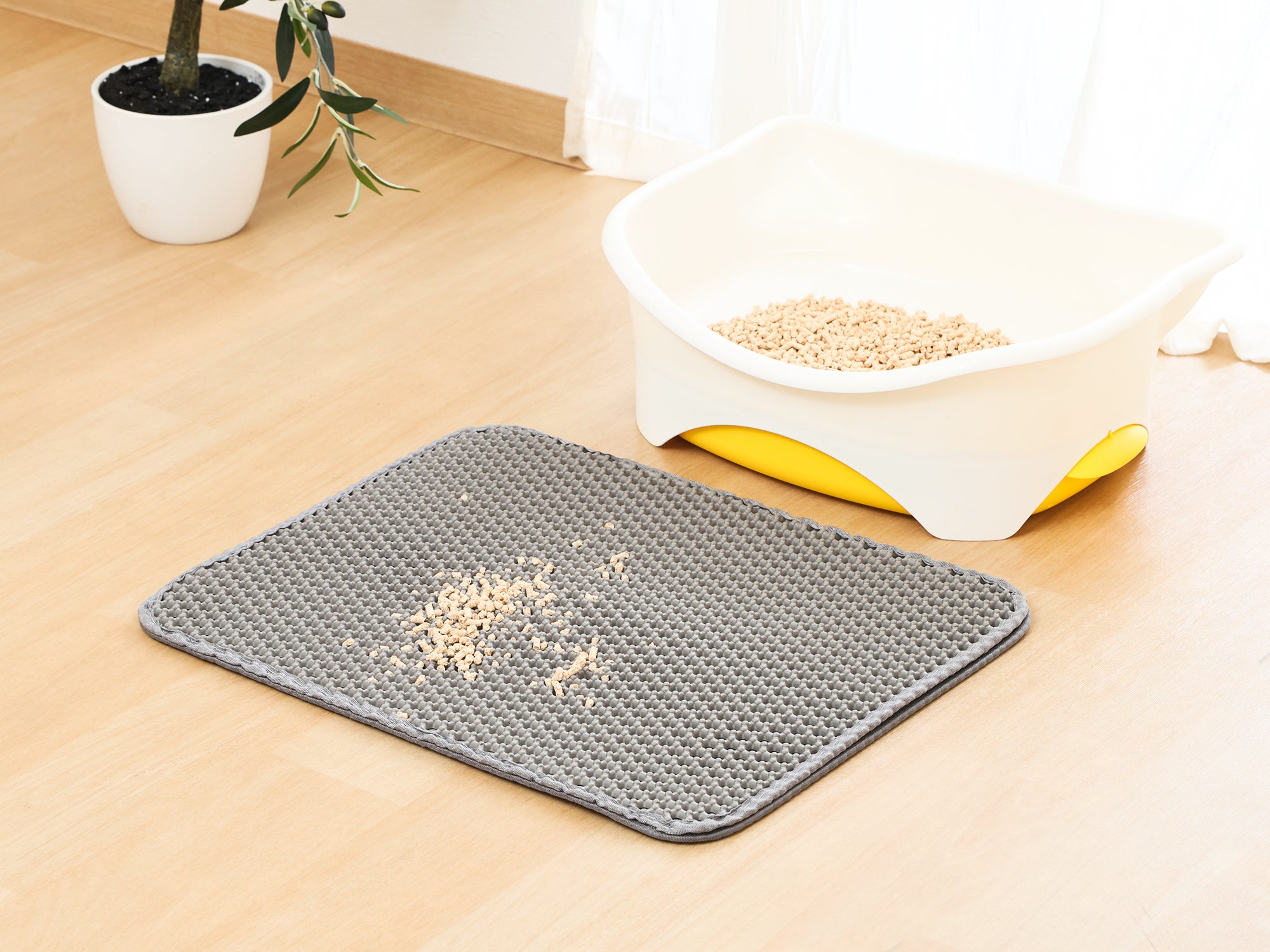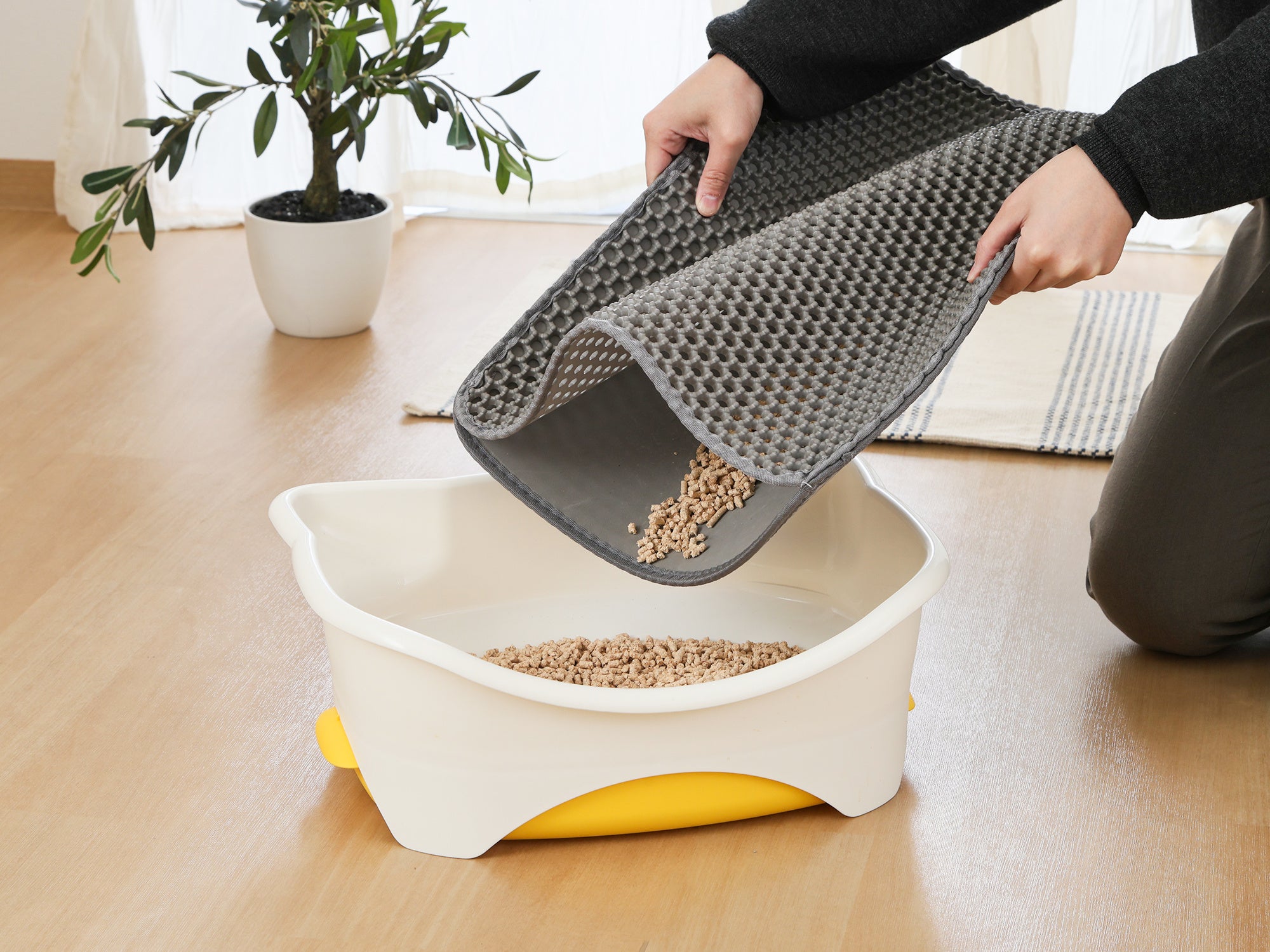 猫トイレの前に敷くことで、肉球に付いた猫砂をしっかりキャッチし、床への飛び散りを防ぐマットです。凹凸のある表面構造が細かな砂まで受け止めるとともに、上層の穴から下層へ砂が落ちる二重構造を採用。下層にたまった砂はまとめて回収できるため、お手入れもスムーズです。柔らかなEVA素材を使用しており、猫の足にもやさしい踏み心地。防水仕様で汚れを洗い流しやすく、乾きも早いため清潔に使い続けることができます。猫砂マットとしてだけでなく、食器周りのマットとしても活用できる多用途なアイテムです。