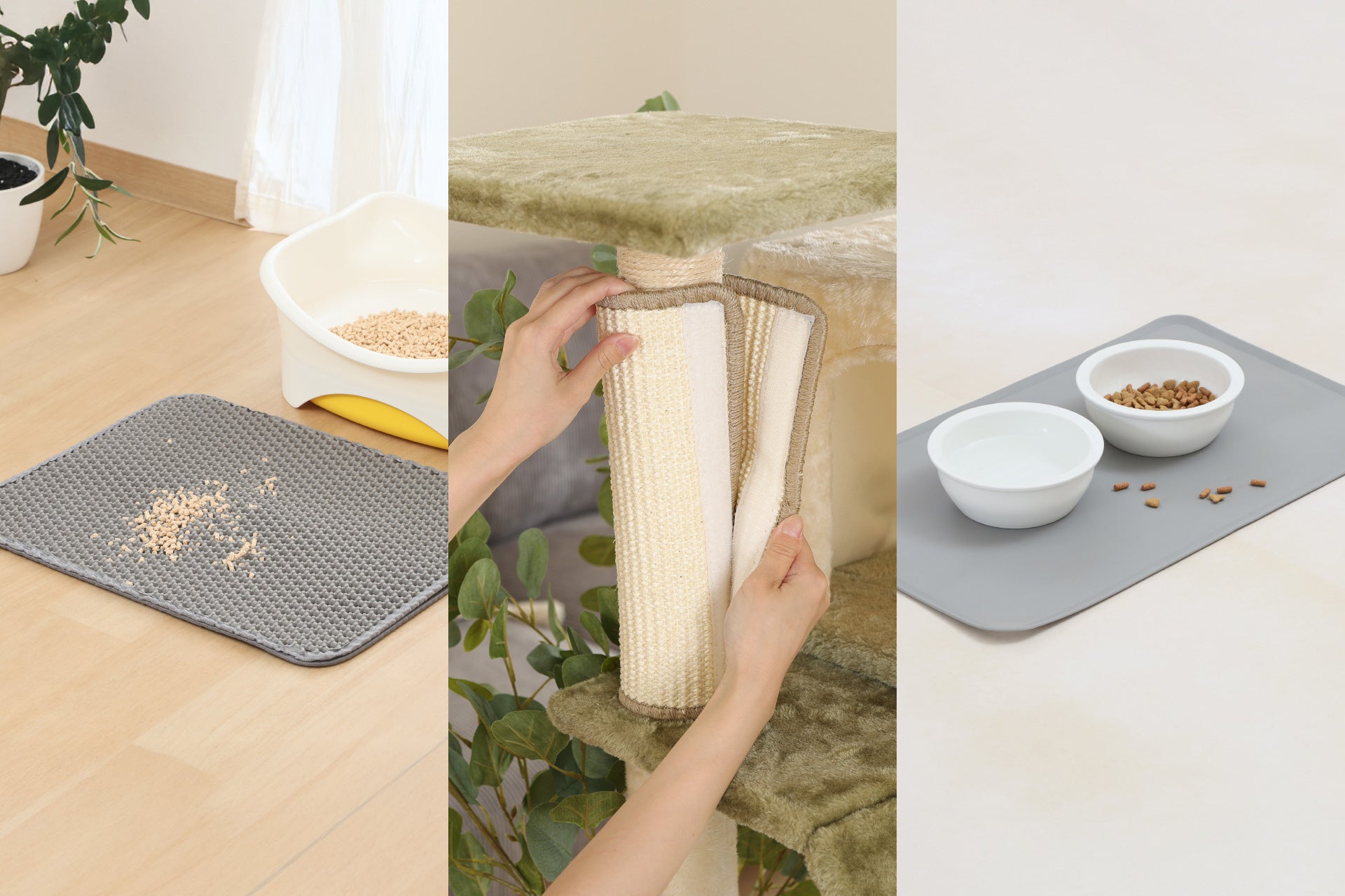 今回発売するのは、食事・トイレ・爪とぎといったペットの暮らしの基本シーンに着目した3商品です。床の汚れを防ぐ「ペット用防水マット」、猫砂の飛び散りを抑える「猫砂マット」、キャットタワーの支柱などに巻いて使える「くるっと爪とぎシート」をラインアップし、ペットとの日常をより快適に整えるアイテムを提案します。