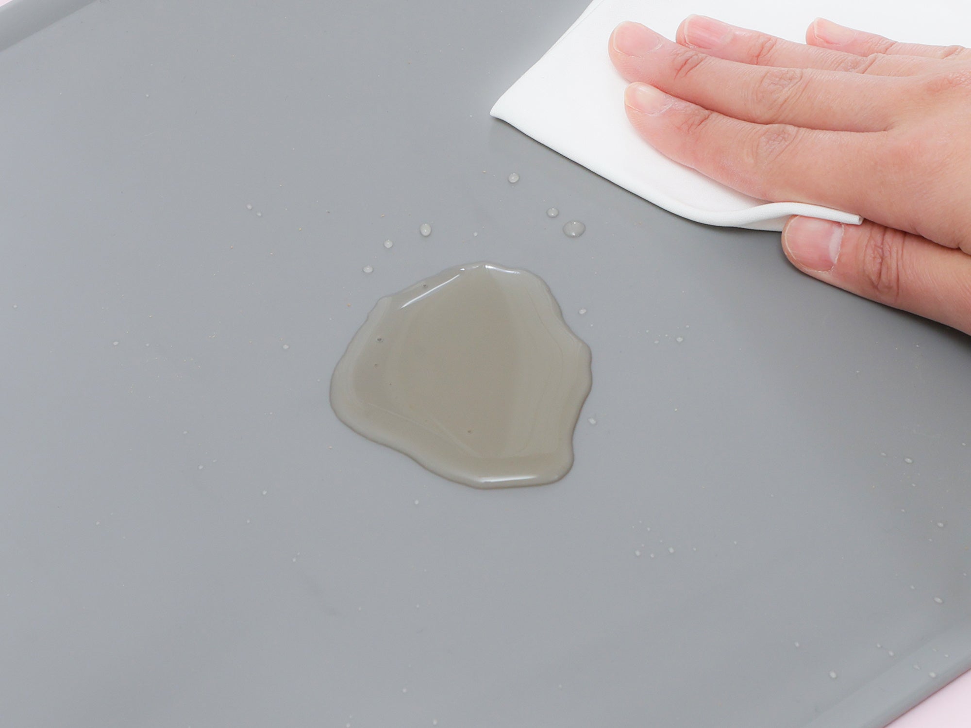 ペットの食器の下に敷くだけで、食べこぼしや水滴から床をしっかり守る防水マットです。フチに高さを設けた設計で、こぼれた水やフードを受け止め、食事スペースを清潔に保ちます。柔らかく丈夫なシリコン素材を採用しており、滑りにくくズレにくいのも特徴。汚れた場合はサッと拭き取るだけでなく、丸洗いも可能でお手入れも簡単です。やわらかな素材のため、使わないときは丸めて収納でき、外出先や旅行時にも便利に持ち運べます。シンプルなグレーカラーに肉球のワンポイントデザインをあしらい、インテリアにも自然になじむデザインに仕上げました。