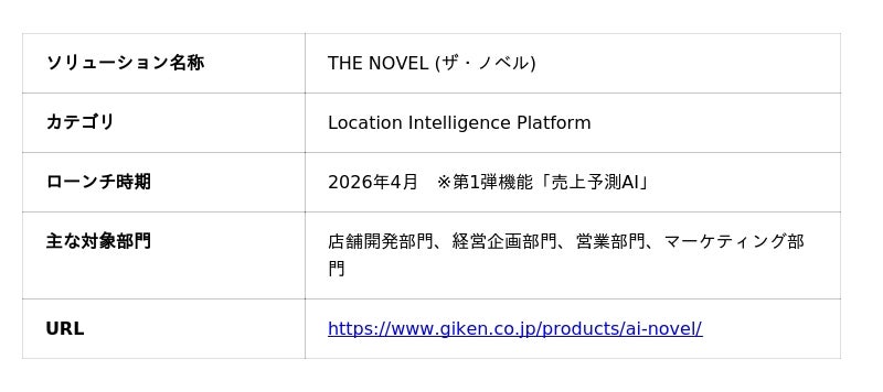 エリアマーケティングGIS(地図情報システム)の国内リーディングカンパニーである技研商事インターナショナル株式会社(名古屋本社:愛知県名古屋市、東京本社:東京都新宿区、代表取締役:小嶌 智海、以下当社)は、2026年4月の提供開始を予定している新AIソリューション、Location Intelligence Platform「THE NOVEL(ザ・ノベル)」のリリースを記念し、期間限定にて第一弾『売上予測AI』 機能を初年度月額10万円相当で利用可能とする「AI導入支援キャンペーン」を実施します。