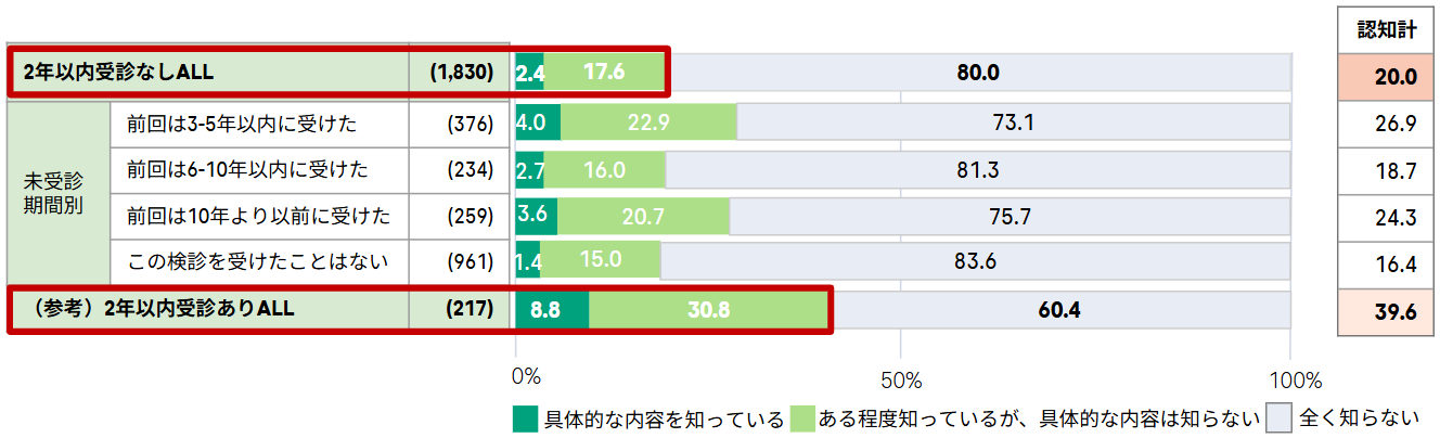 国内では2024年4月より、厚生労働省の指針に基づき一部の市町村では「HPV検査」の導入が始まりました。このことに対して「具体的な内容を知っている」、「ある程度知っている」のは未受診者間で20.0%に留まり、約8割がこの新しい選択肢を認知していないことが判明しました。一方で、2年以内に受診歴がある層では「HPV検査」の認知度が39.6%と、未受診者との間に約20ポイントの差があり、検診から遠ざかっている層と比較して、より積極的に検診に関する情報を受け取っていることわかります(図表3)。