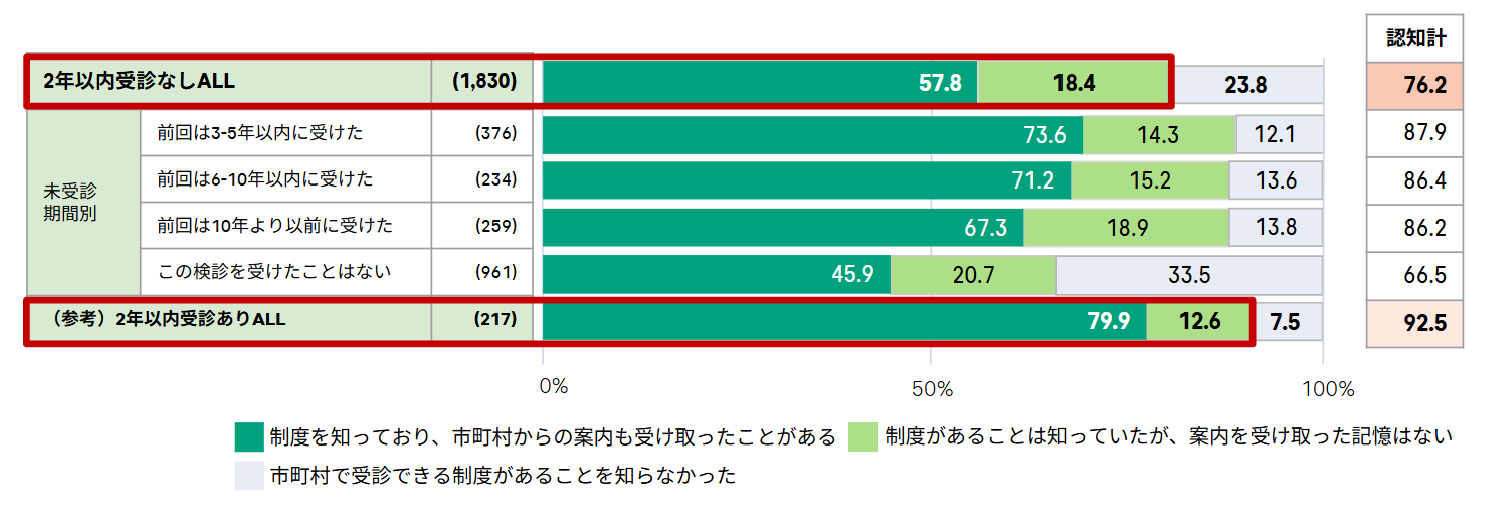 さらに、市町村が実施する子宮頸がん検診の認知度を調査したところ、直近2年以内に受診していない層においても、76.2%が自治体検診の存在を「知っている」と回答しています。自治体検診に関する基本的な情報は広く浸透していることがわかります(図表 10)。一方で、自治体検診の認知度が高いにもかかわらず、受診に至っていない現状において、未受診者に実際の受診行動を促すには、心理的・物理的な障壁を取り除き「行動に移す」ためのさらなる具体的なアプローチが必要とされます。
