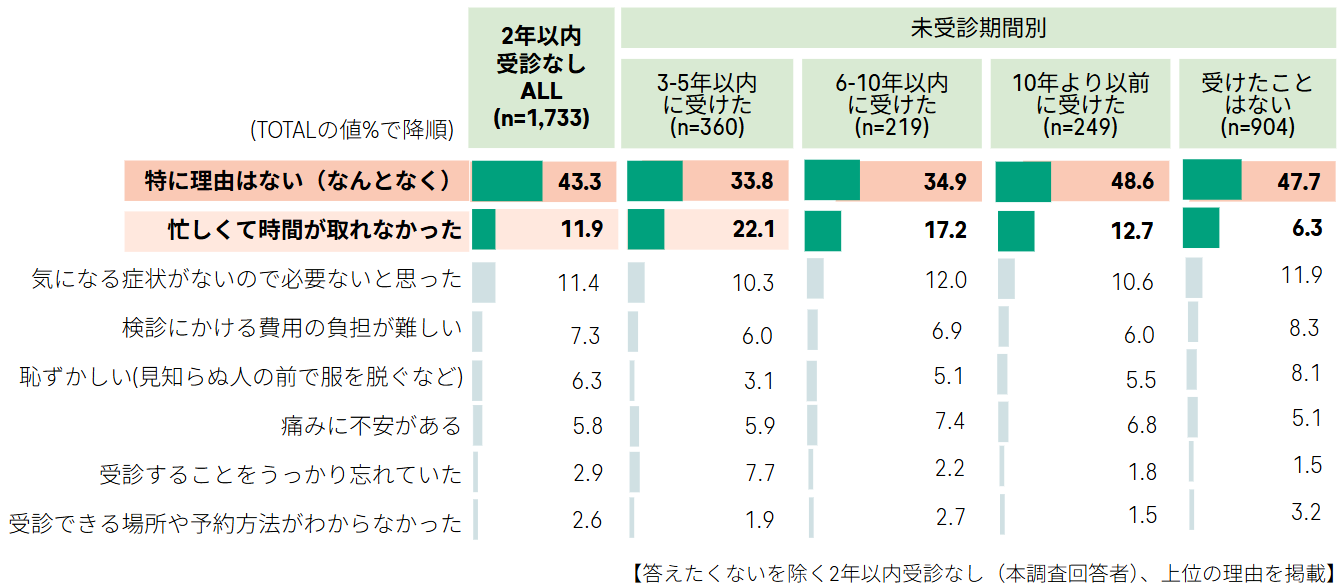 子宮頸がん検診意識調査:未受診の理由は「なんとなく」が4割以上で最多 「5年に1回のHPV検査」の提示で、一定割合が受診に前向きな意向を示す