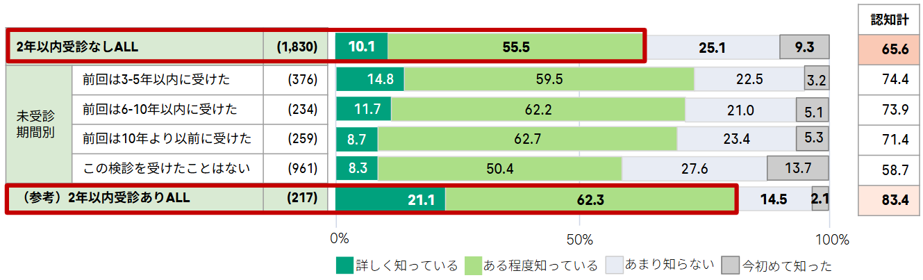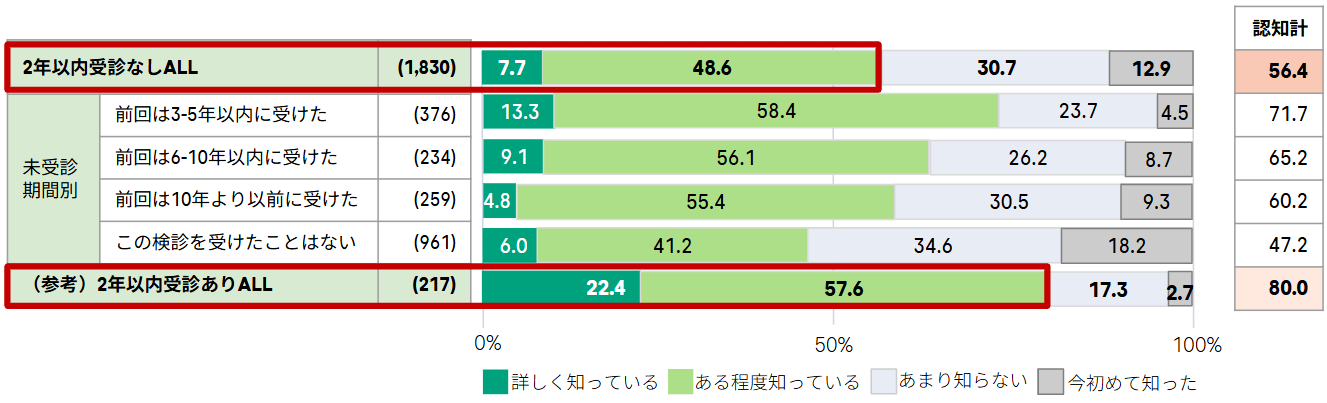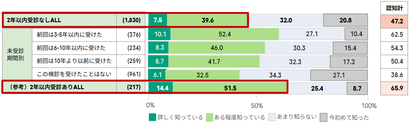 今回の調査では、子宮頸がん検診の未受診期間が長い層ほど、検診や疾患に関する知識・情報認知が低い傾向にあることも明らかになりました。例えば、子宮頸がんは「自覚症状がないまま進行すること」(図表 6)や「早期発見・早期治療で治ること」(図表 8)といった疾患リスクに関する知識が、直近2年以内に受診した層に比べて、未受診層の平均は20ポイント以上低いことがわかります。未受診期間が長い層に対しては、子宮頸がん検診の具体的な価値と、その重要性を浸透させていく必要があります。