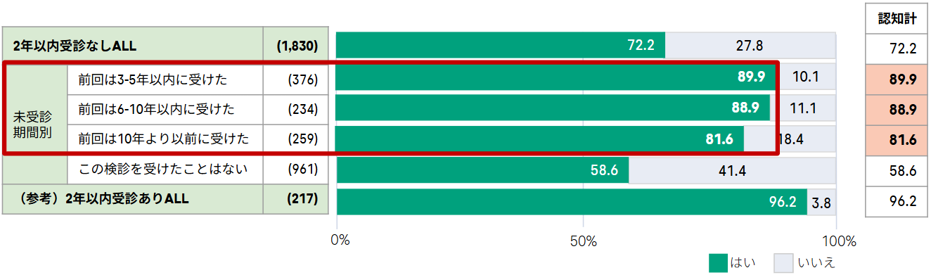 一方で、直近2年間は受診していないものの、過去に受診経験のある層の8割以上が「定期的な受診の必要性」を認識しています(図表 2)。この「定期受診の必要性に対する高い認知」と「実際の行動」のギャップを埋めるためには、個人の意識啓発に留まらず、受診を阻む心理的・物理的なハードルを構造的に改善し、受診停滞期にある層を具体的な受診行動へと促すことが必要と考えられます。