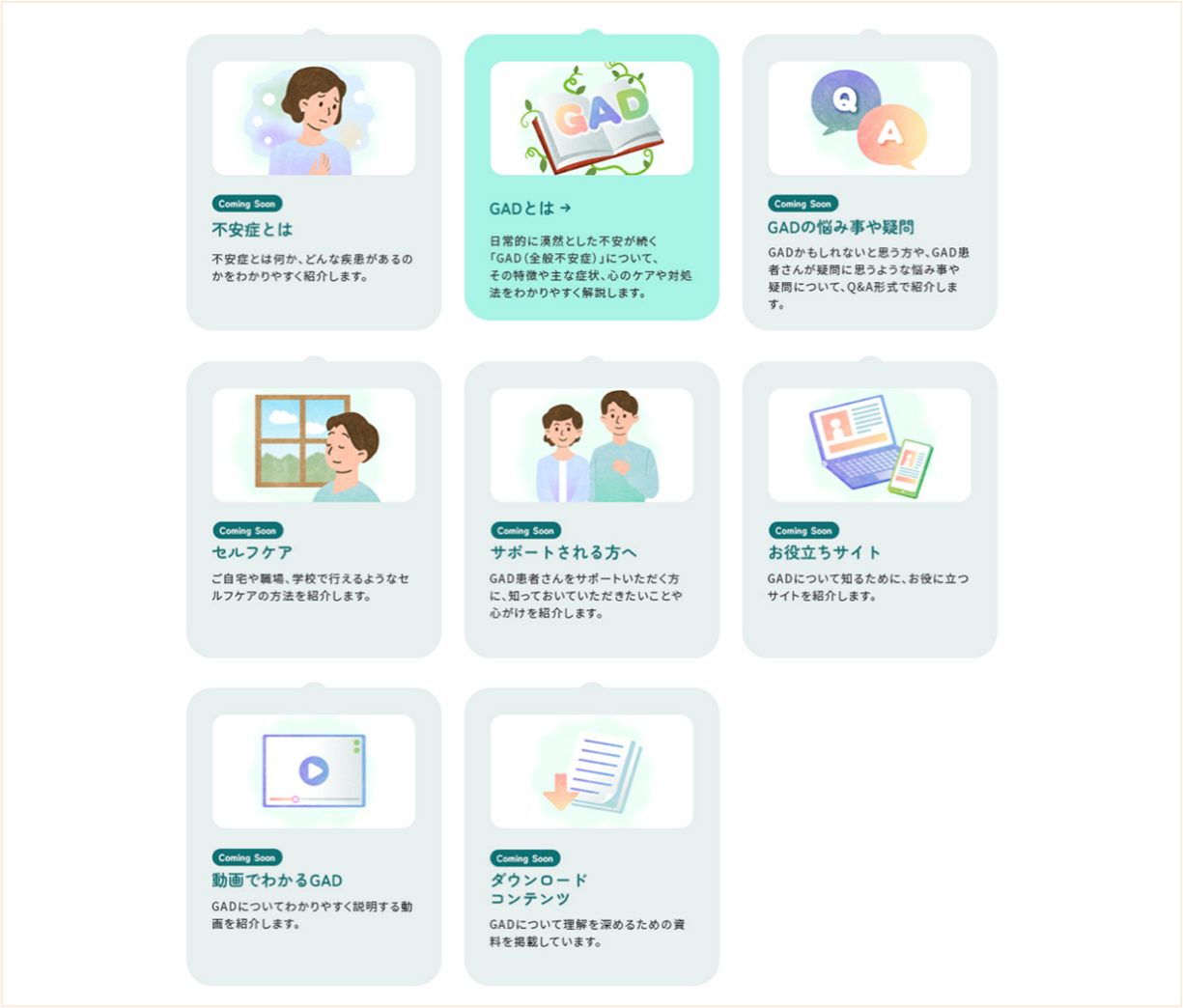 新たな治療選択肢の登場に伴い、今までご自身の症状を性格ととらえて我慢してきた方、症状に気づきながら受診をためらっていた方に対するGADの情報アクセスへのニーズが高まることが予想されます。今回のリニューアルでは、「治療できる『心配性』があります。」をコンセプトに、GADに悩む当事者の方やそのご家族、支援者、医療関係者など、多くの方々に役立つ情報を網羅し、疾患の正しい理解と早期発見・早期相談につながる内容を提供しています。
