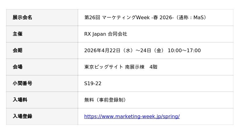 株式会社TeN(本社:東京都渋谷区、代表取締役:廣瀬由典)は、2026/4/22(水)~4/24(金)に東京ビックサイトで開催される、日本最大級のマーケティング展示会「マーケティングWeek(MaS-マズ-)2026春展」に出展いたします。