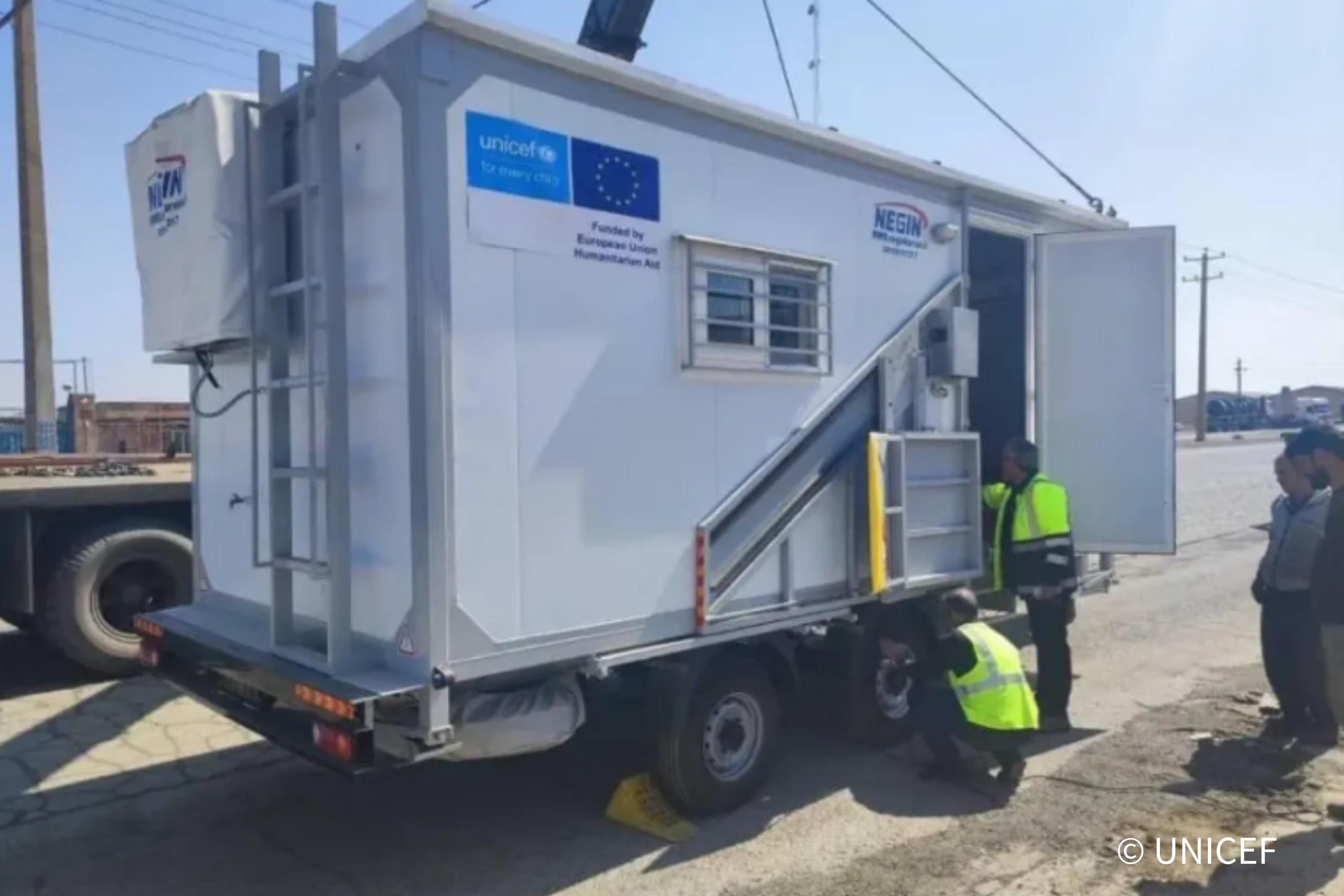 医療ユニットを備えた、ユニセフ支援の車両。高まる支援ニーズを受け、ユニセフは子どもと家族が保健サービスにアクセスできるよう、こうした車両を活用した移動式クリニックの設置を支援している(イラン、2026年3月撮影)(C) UNICEF