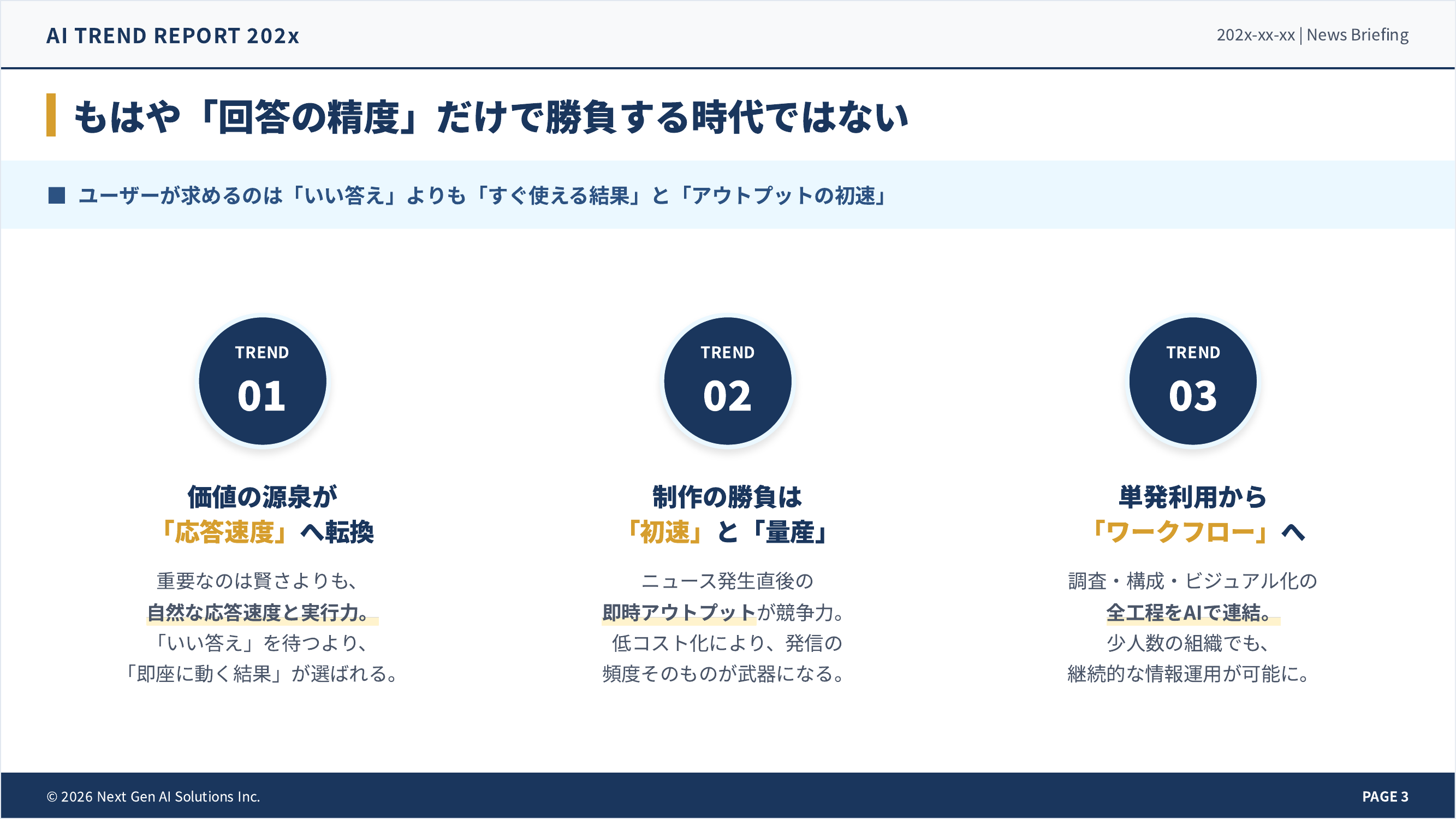 4つ目は「最新ニュース・トレンド解説スライド」です。業界の最新ニュースやトレンドを即時スライド化できるサンプルです。トレンド情報をタイムリーに発信したいものの、マーケティング担当が少人数のためスライド作成が追いつかず発信の鮮度が落ちてしまうという課題に対応しており、ニュース記事のURLやPDFを素材として投入するだけで、解説スライドをすぐに作成することが可能です。トレンド情報を即時発信できる体制を構築することで、業界における自社の情報発信力と専門性を高められます。