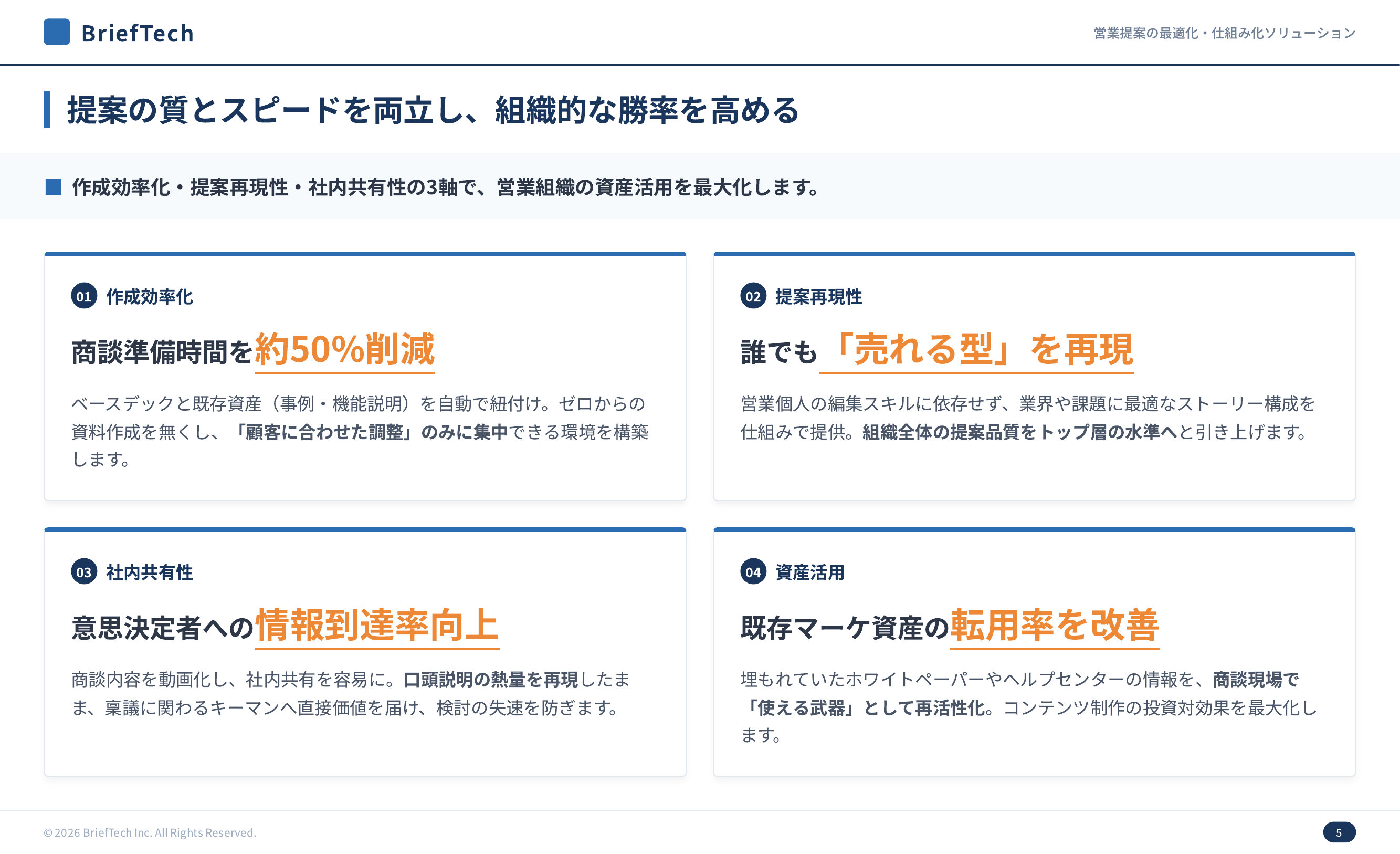 専門的なデザインスキルがなくても、高品質なスライドや動画を制作することが可能となり、営業・マーケティング・IR部門における資料作成の負担を軽減します。
