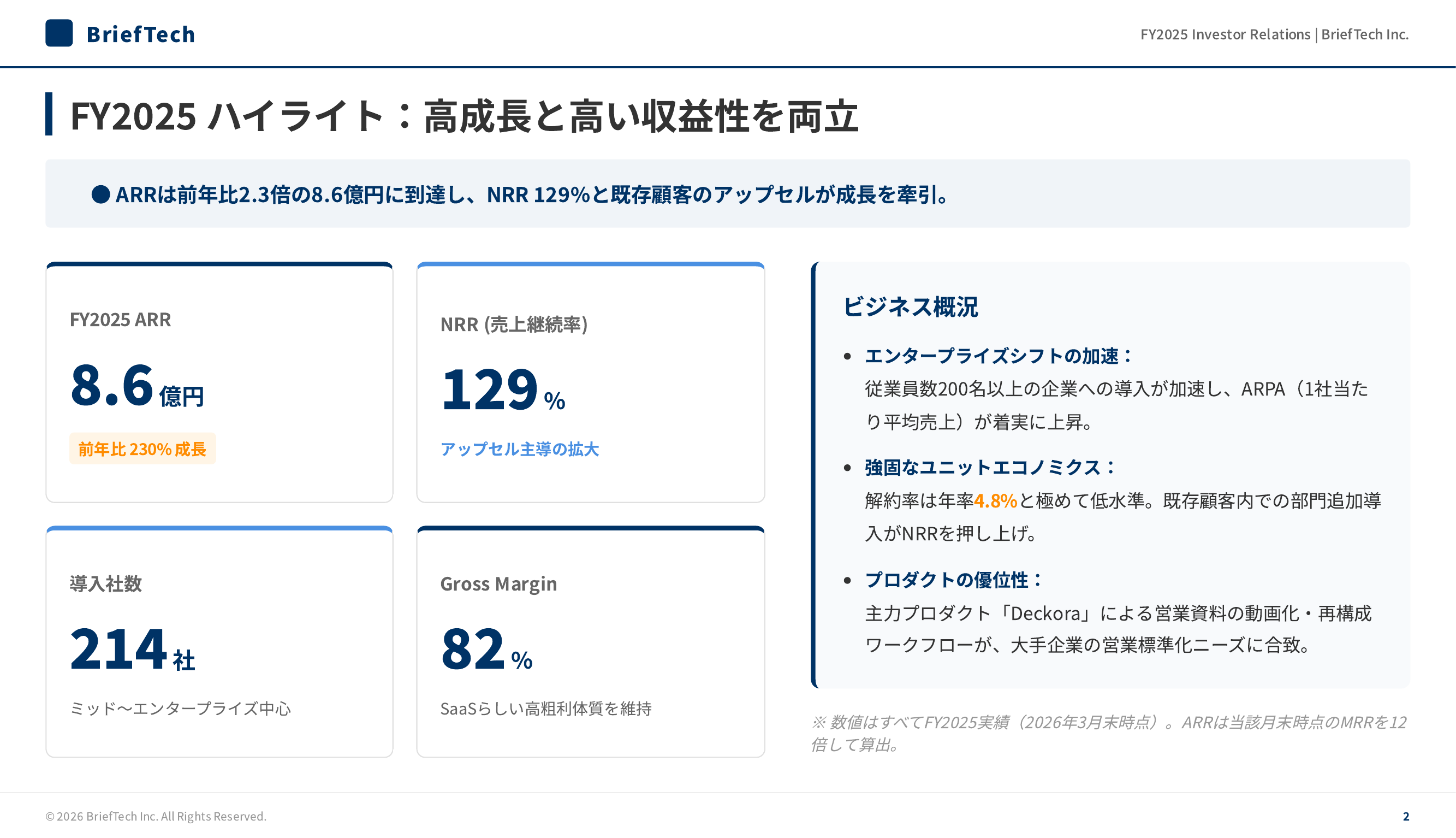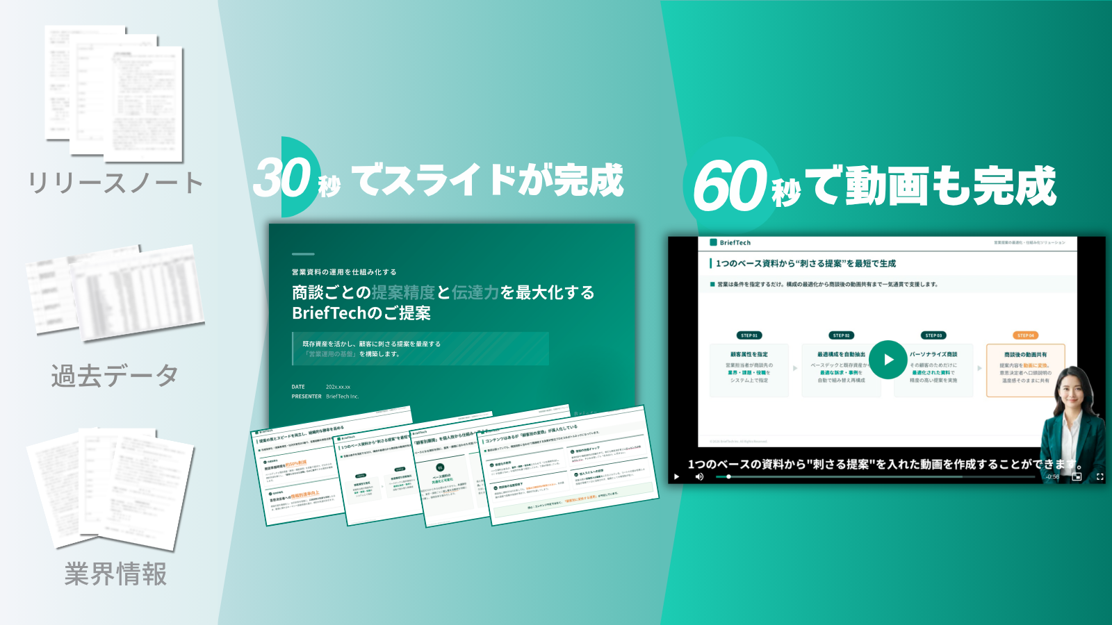 PDFやリリースノートを投入するだけで要点整理されたスライドと動画を自動生成。商談・ウェビナー・株主向け開示まで対応する5つのテンプレートを提供