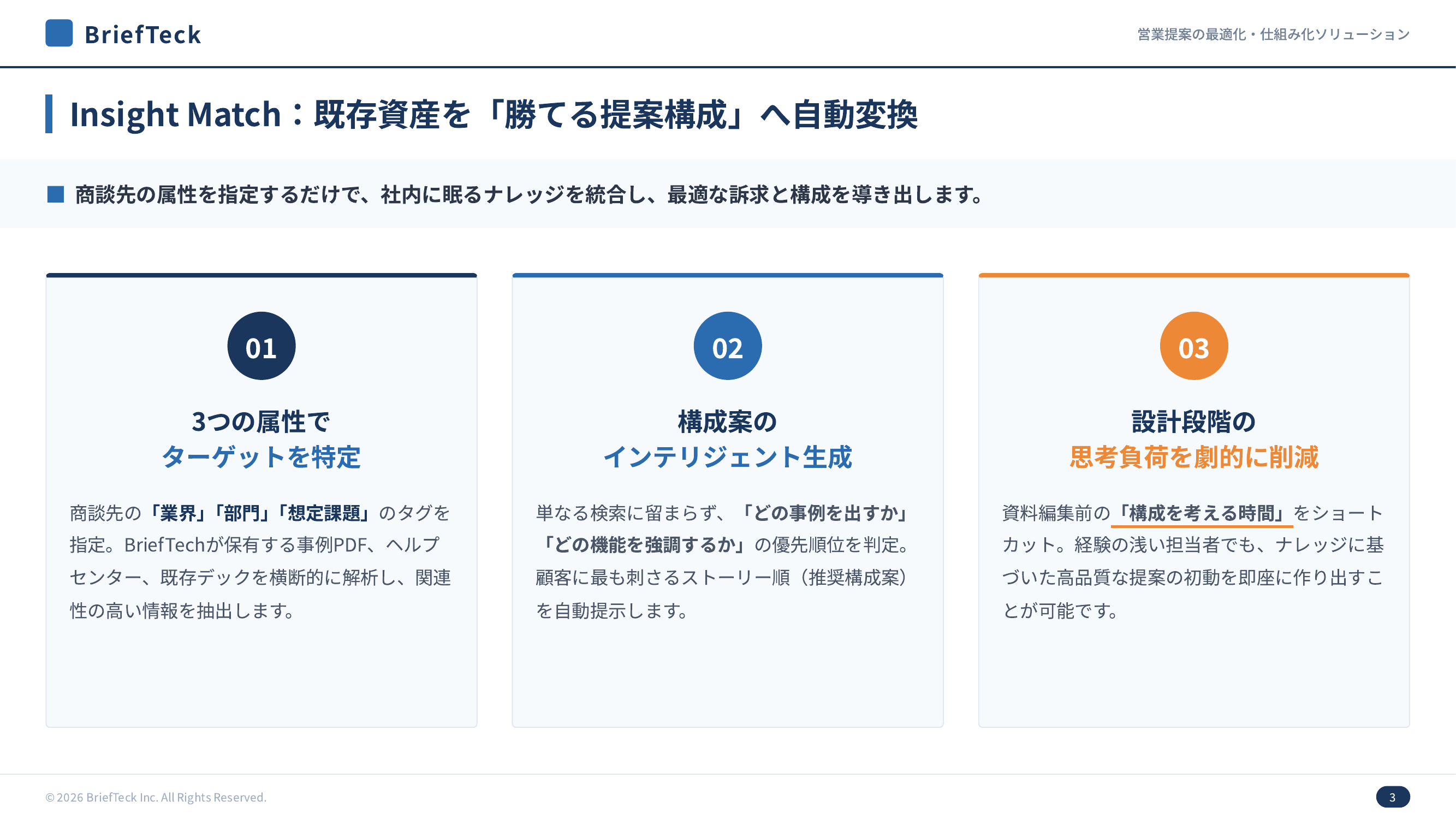1つ目は「自社サービス説明スライド」です。40ページ超のホワイトペーパーや既存提案書を、10ページ程度の要点スライドに自動変換できるサンプルです。商談やウェビナーのたびにサービス説明資料が必要であるものの、タイムリーに資料を用意できないという課題に対応しており、ホワイトペーパーPDFや既存提案書をそのまま素材として投入するだけで、要点が整理されたスライドをすぐに制作することが可能です。これにより、商談機会を逃すことなく、現場の営業担当者自身が必要なタイミングでサービス説明資料を準備できるようになります。