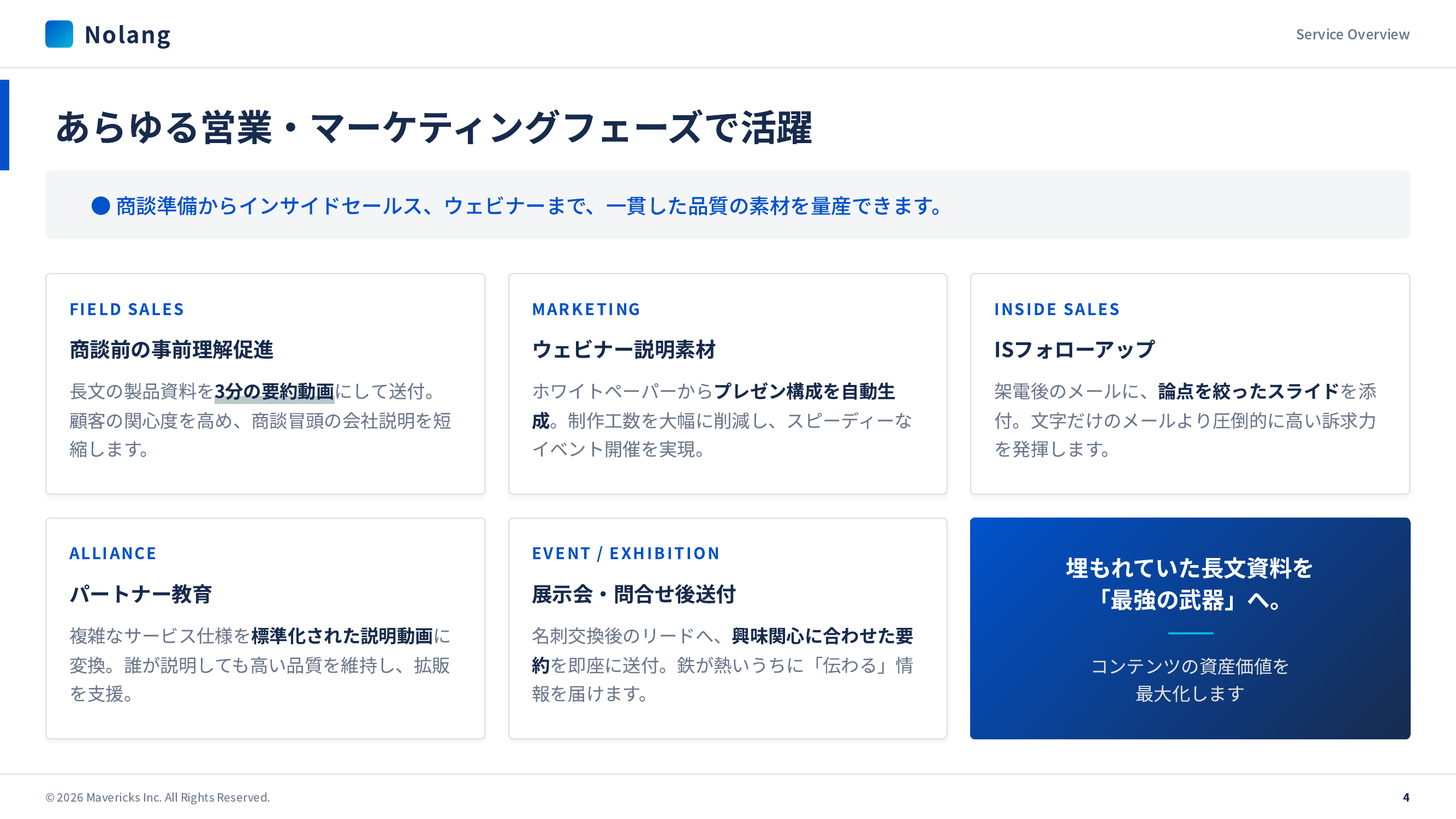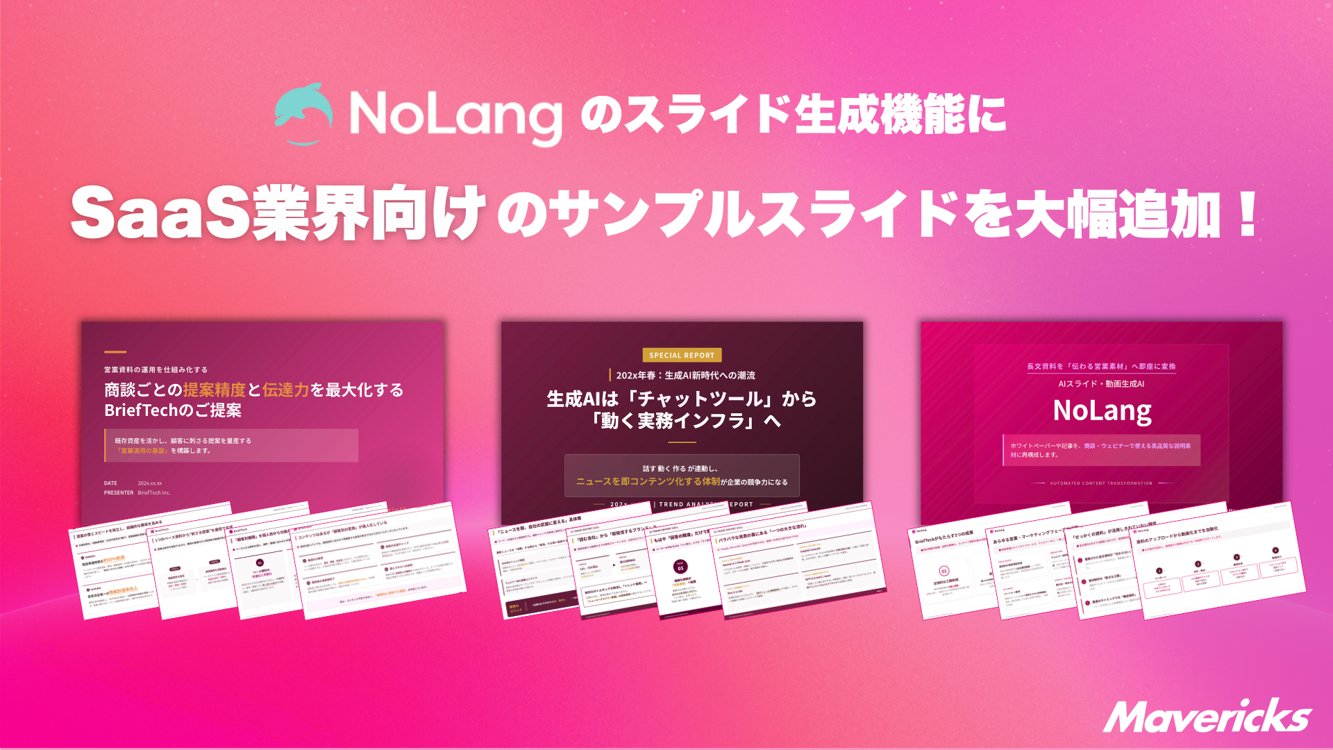 株式会社Mavericksは、動画生成AI「NoLang」のスライド生成機能において、SaaS・プロダクト企業向けのサンプルスライドを公開。営業・マーケ・IRの資料作成を一気通貫で効率化