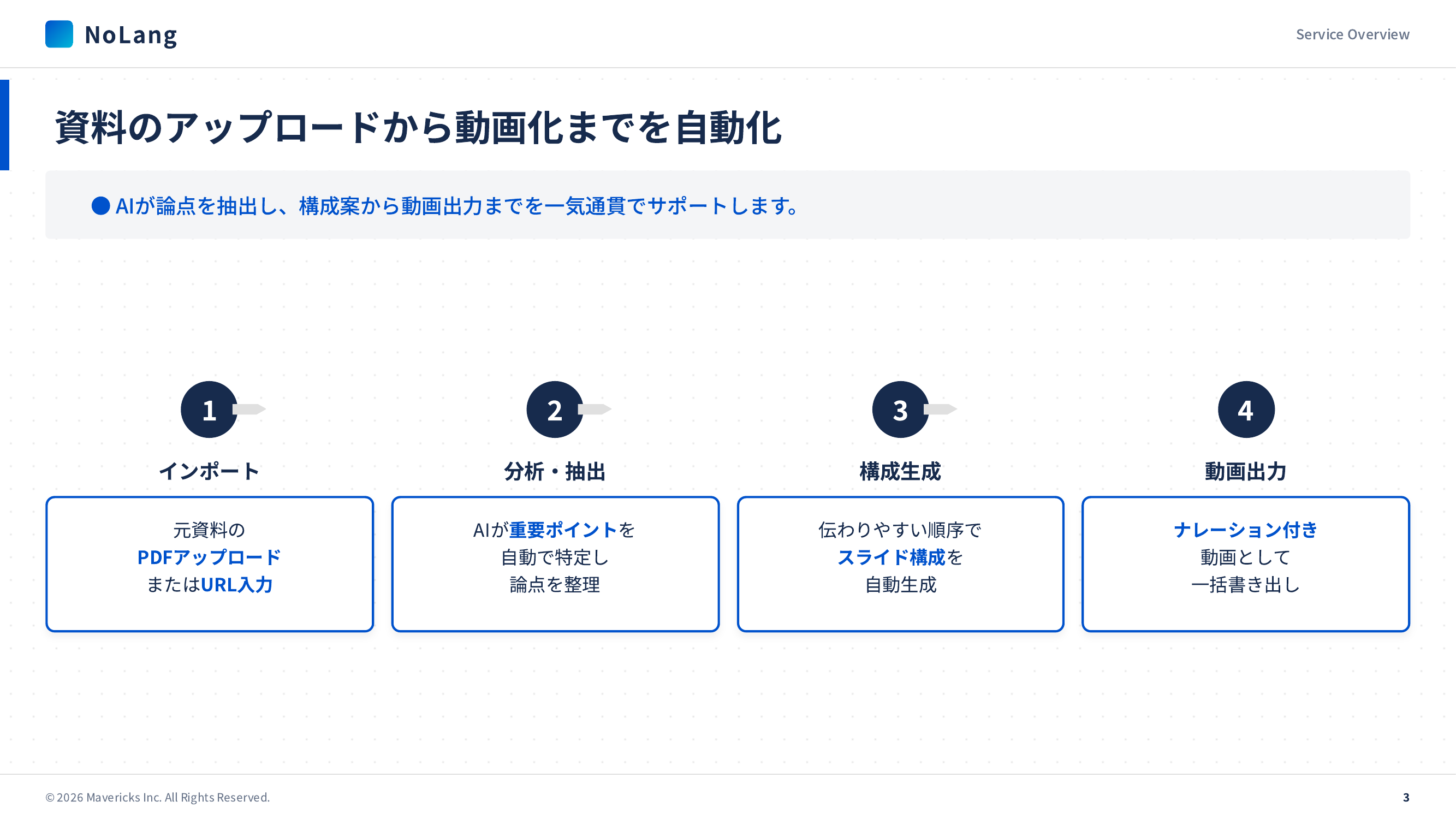 日本発、動画生成AI「NoLang(ノーラン)」を提供する株式会社Mavericks(本社:東京都文京区、代表者:Founder CEO 奥野 将太)は、この度、NoLangのスライド生成機能において、SaaS・自社プロダクト企業向けのサンプルスライドを新たに公開しました。サービス説明やセールスデック、機能アップデート案内、IR資料など、SaaS企業の業務で頻繁に発生する資料作成のニーズに対応した5つの活用例をテンプレート化。リリースノートや既存の提案書を投入するだけで、要点が整理されたスライドや動画を自動生成できます。営業・マーケティング・IR部門における資料作成の負担を軽減し、限られたリソースでのコンテンツ発信の効率化に貢献します。